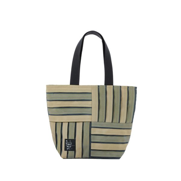 こちらは畳縁を繋ぎ合わせて生み出された網代模様が個性を放つ新作バッグで、