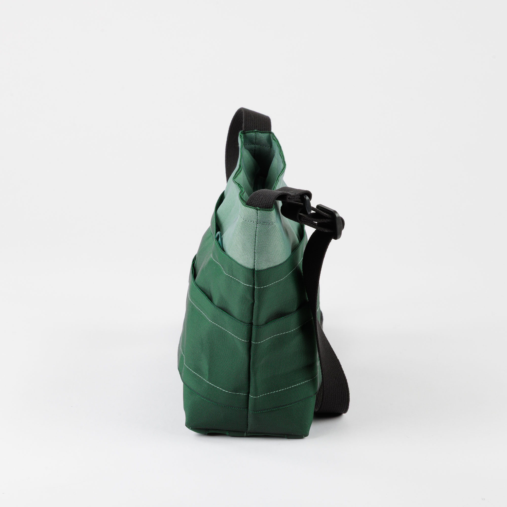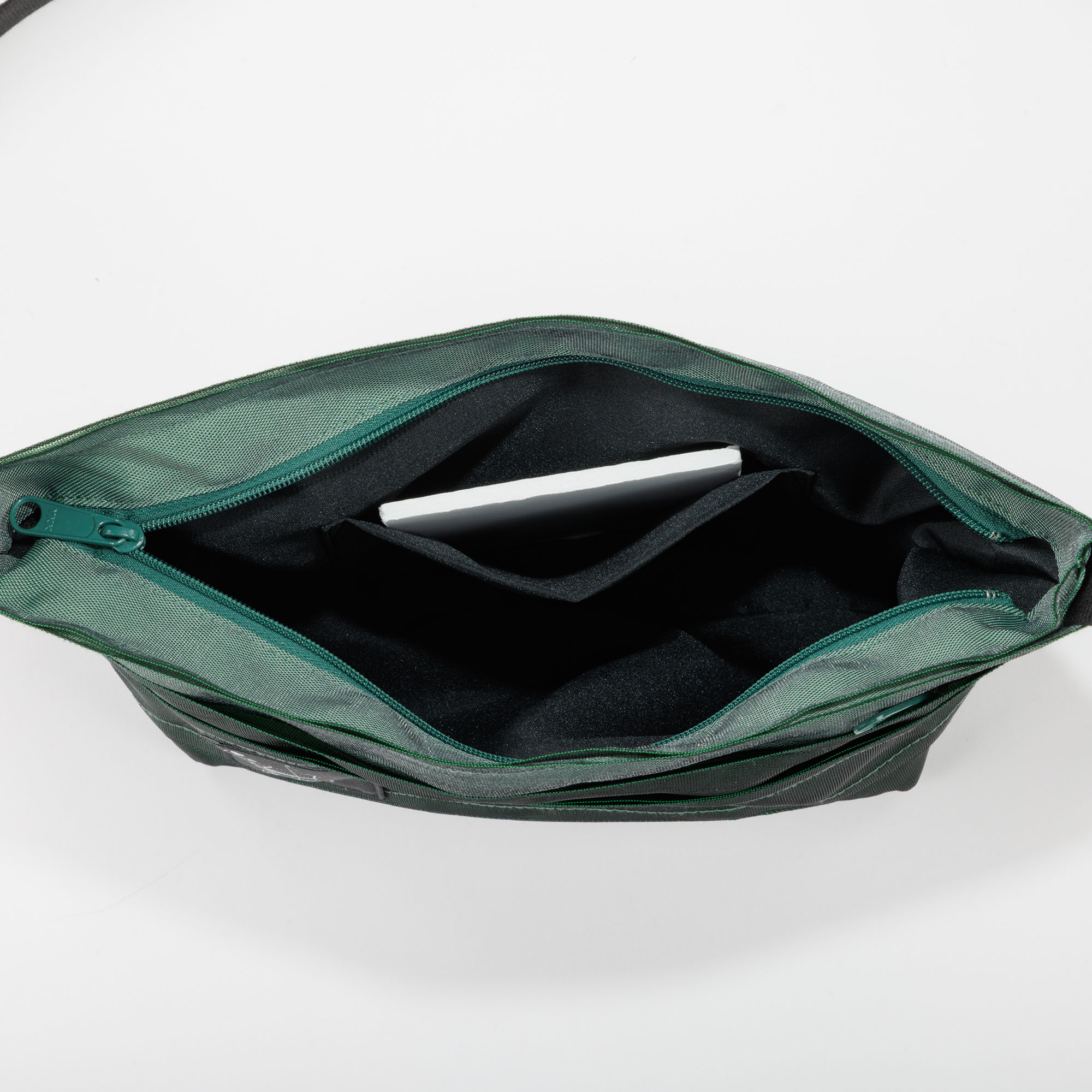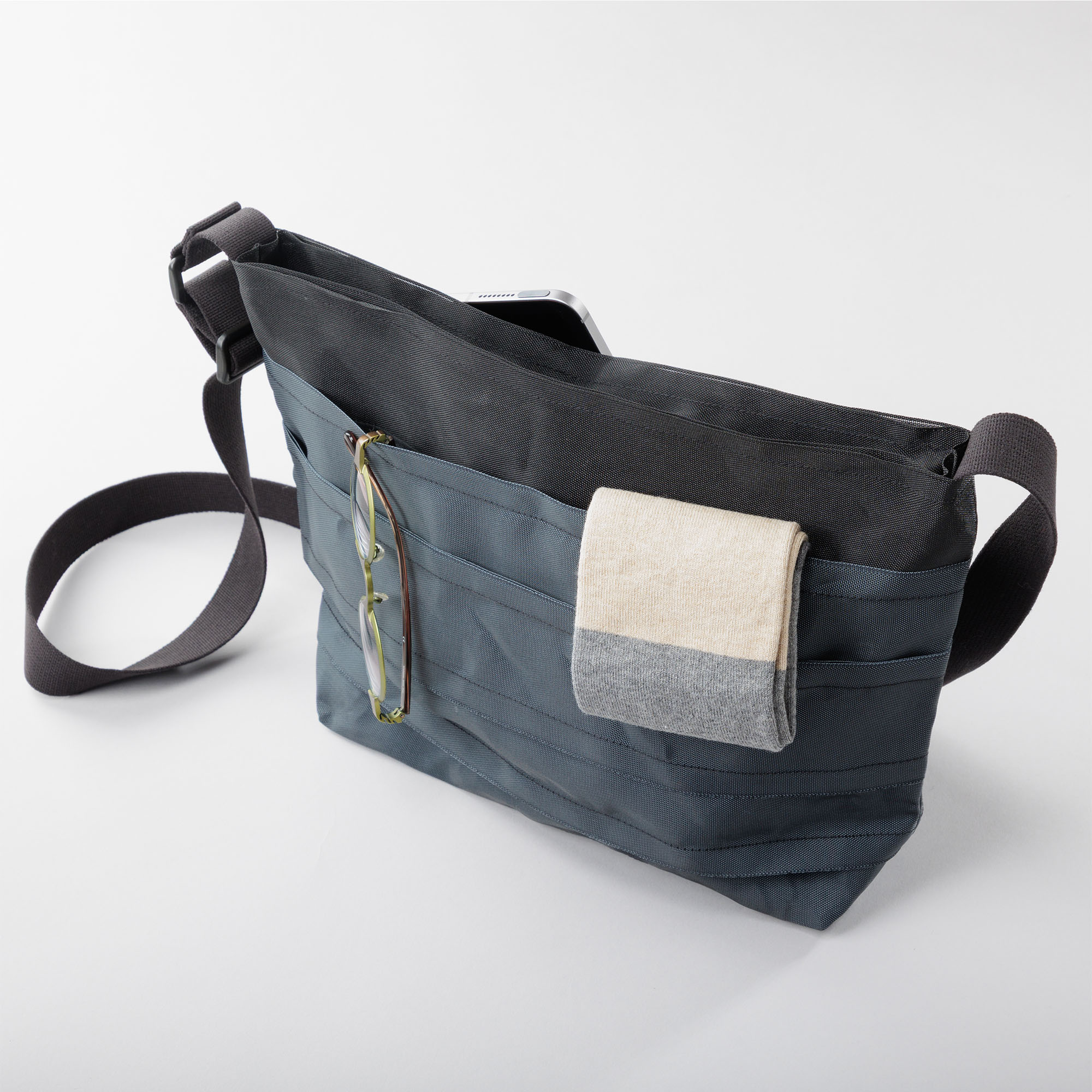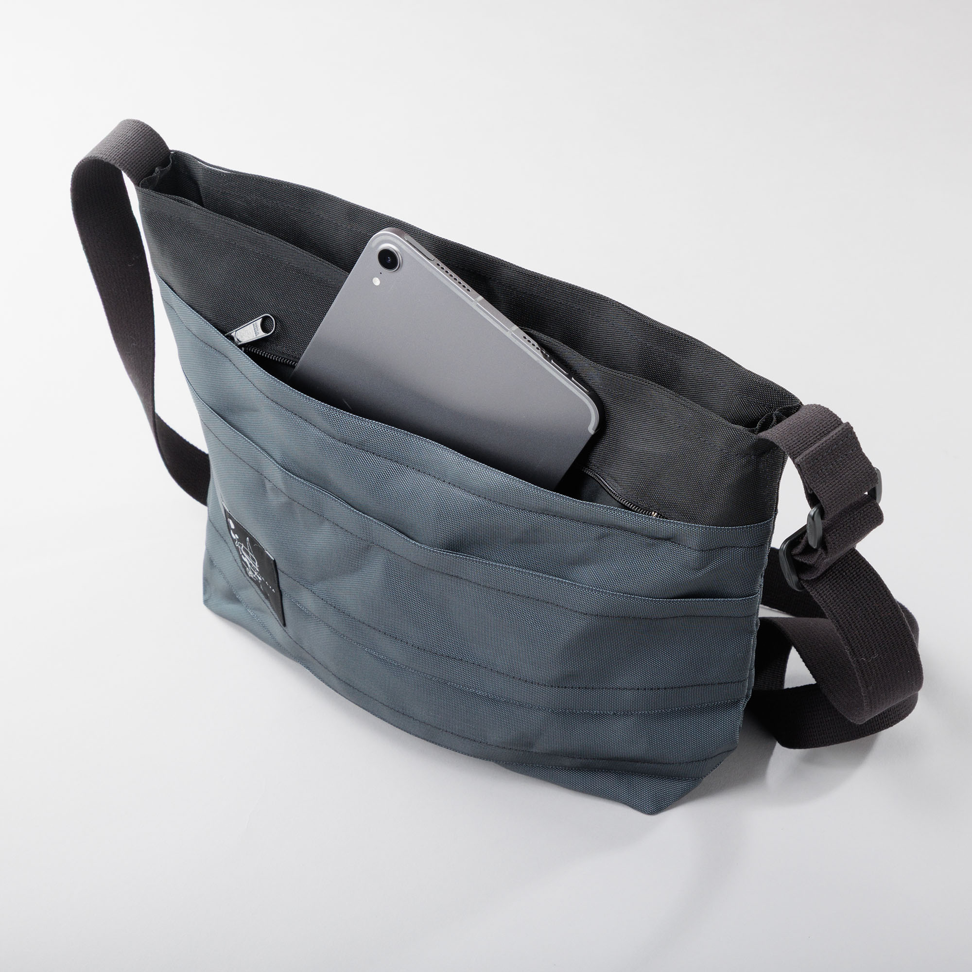 1つのファスナー付き外ポケットと2つのオープンタイプ外ポケット、及び1つの内袋があり携帯電話や財布、パスケースなど大切なものも安心して入れられます。