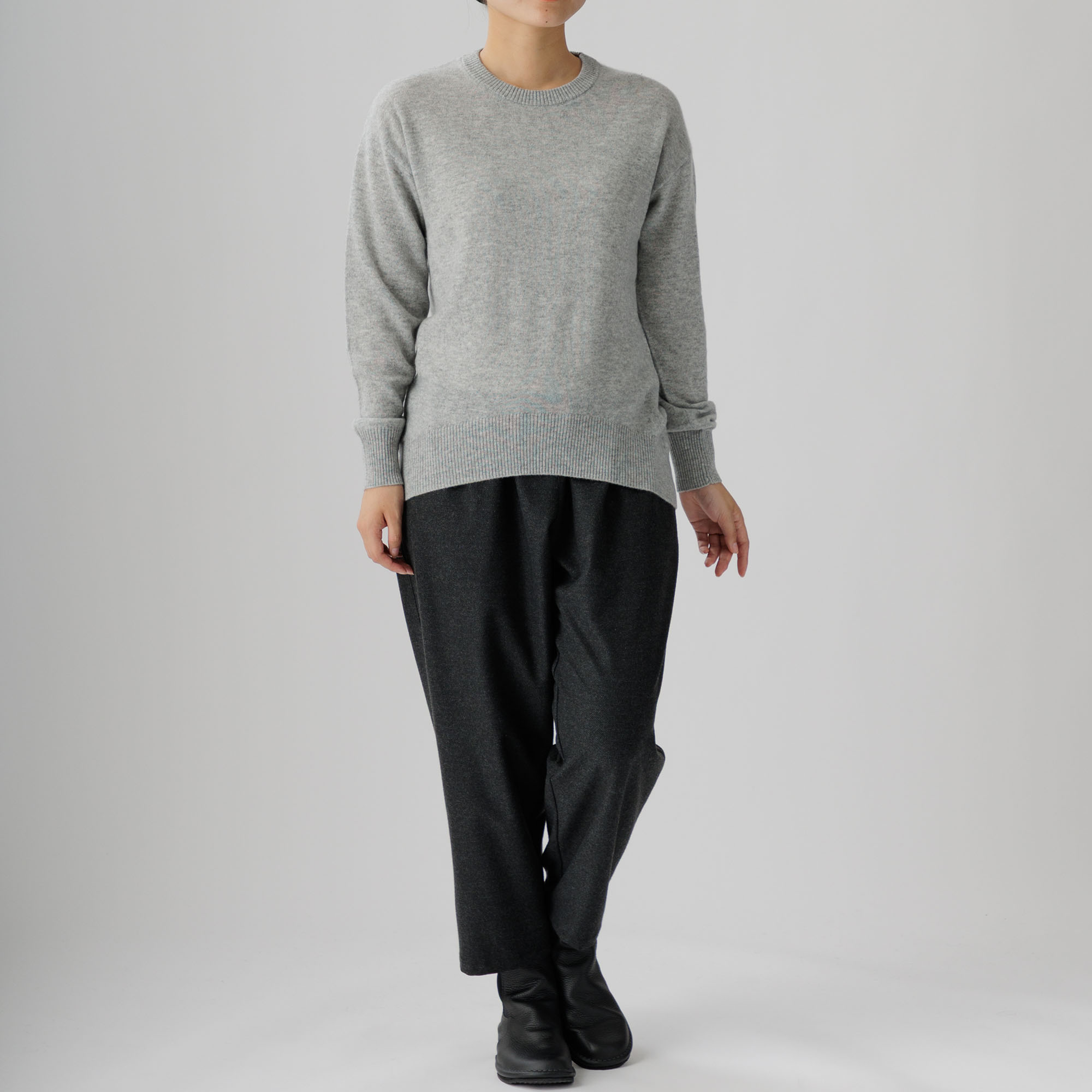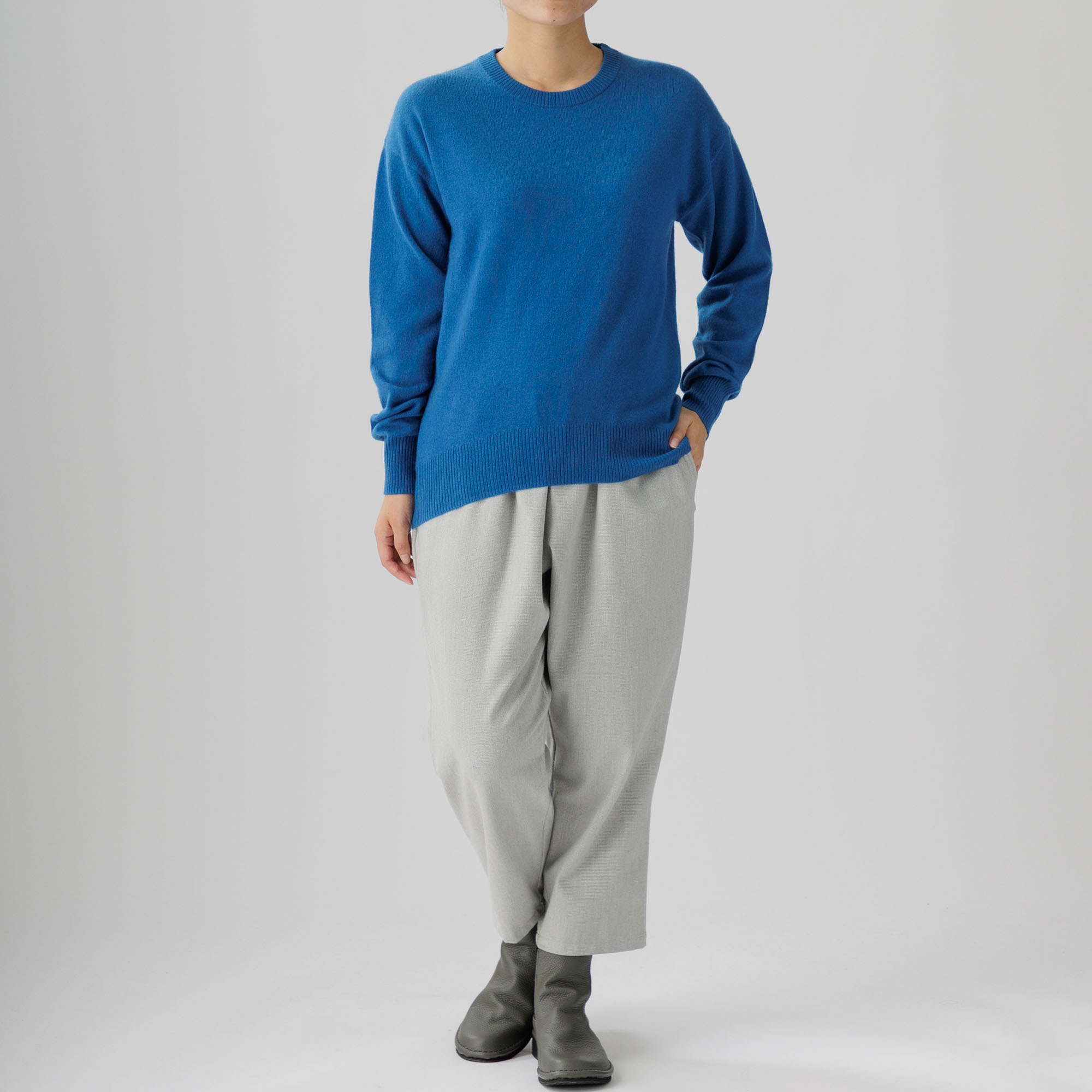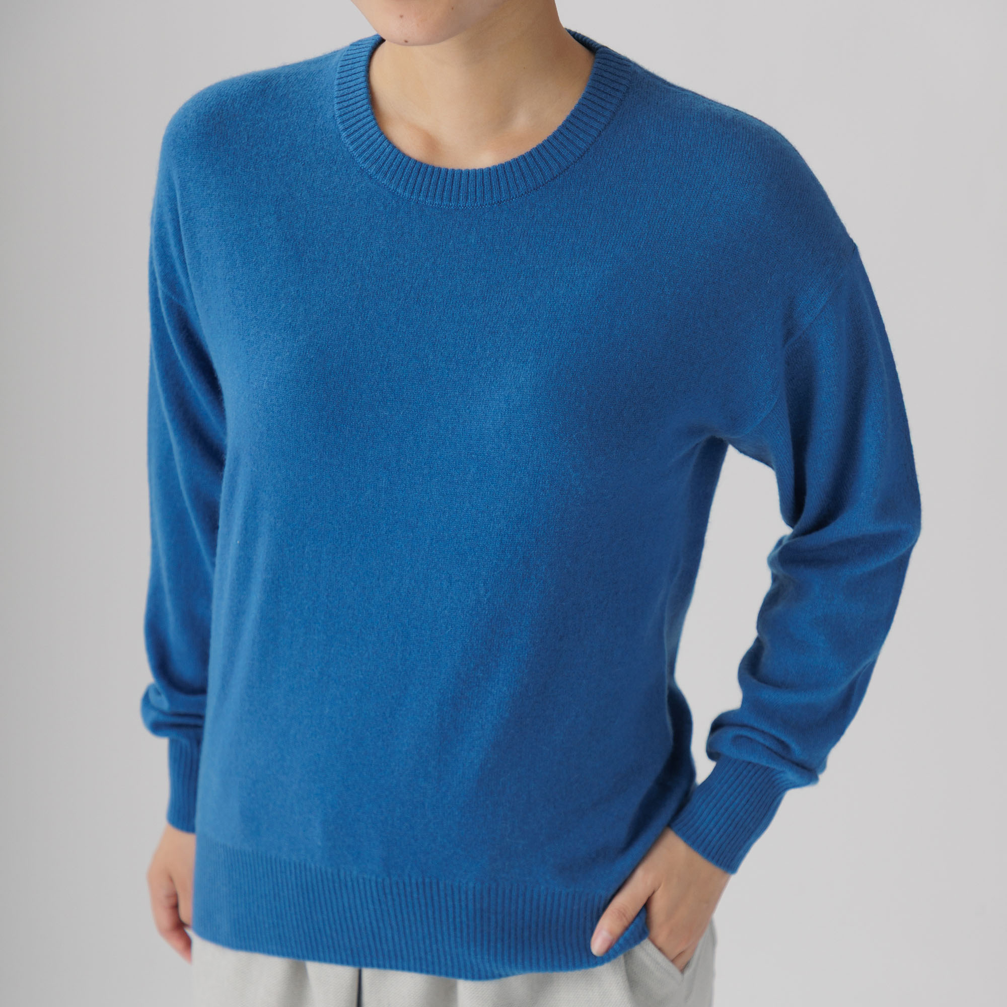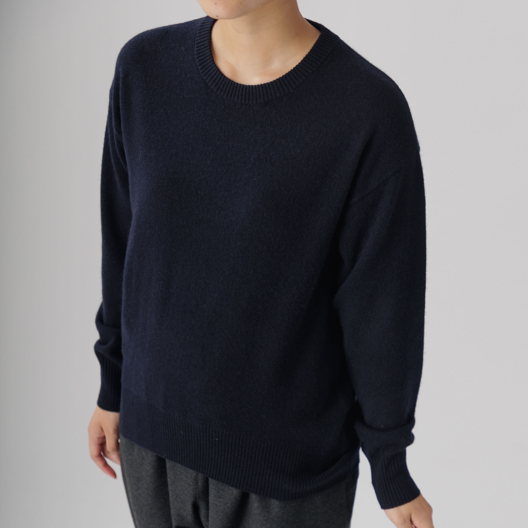 こちらはカシミヤ100%ならではの暖かさと優しい着心地が魅力の丸首ニットプルオーバー。