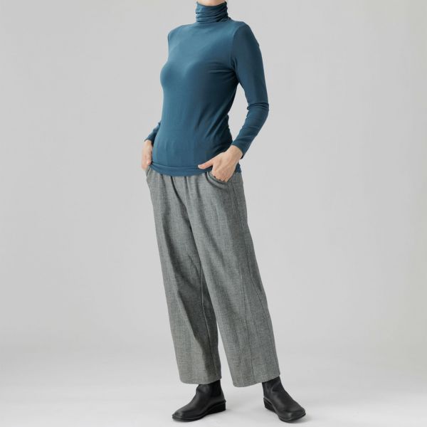襟にシャーリングが入った個性的なハイネックプルオーバーはいかがですか。