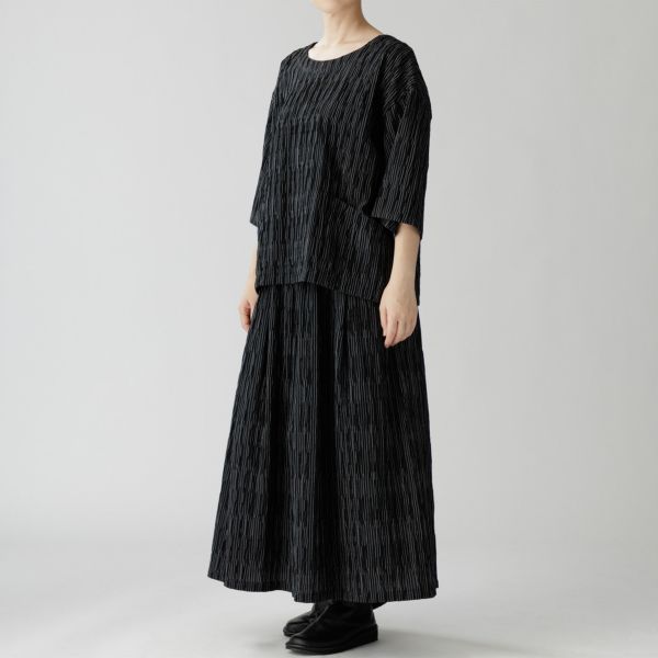 表情豊かで存在感あふれる生地のプルオーバーとスカートのコーディネートはいかがですか。