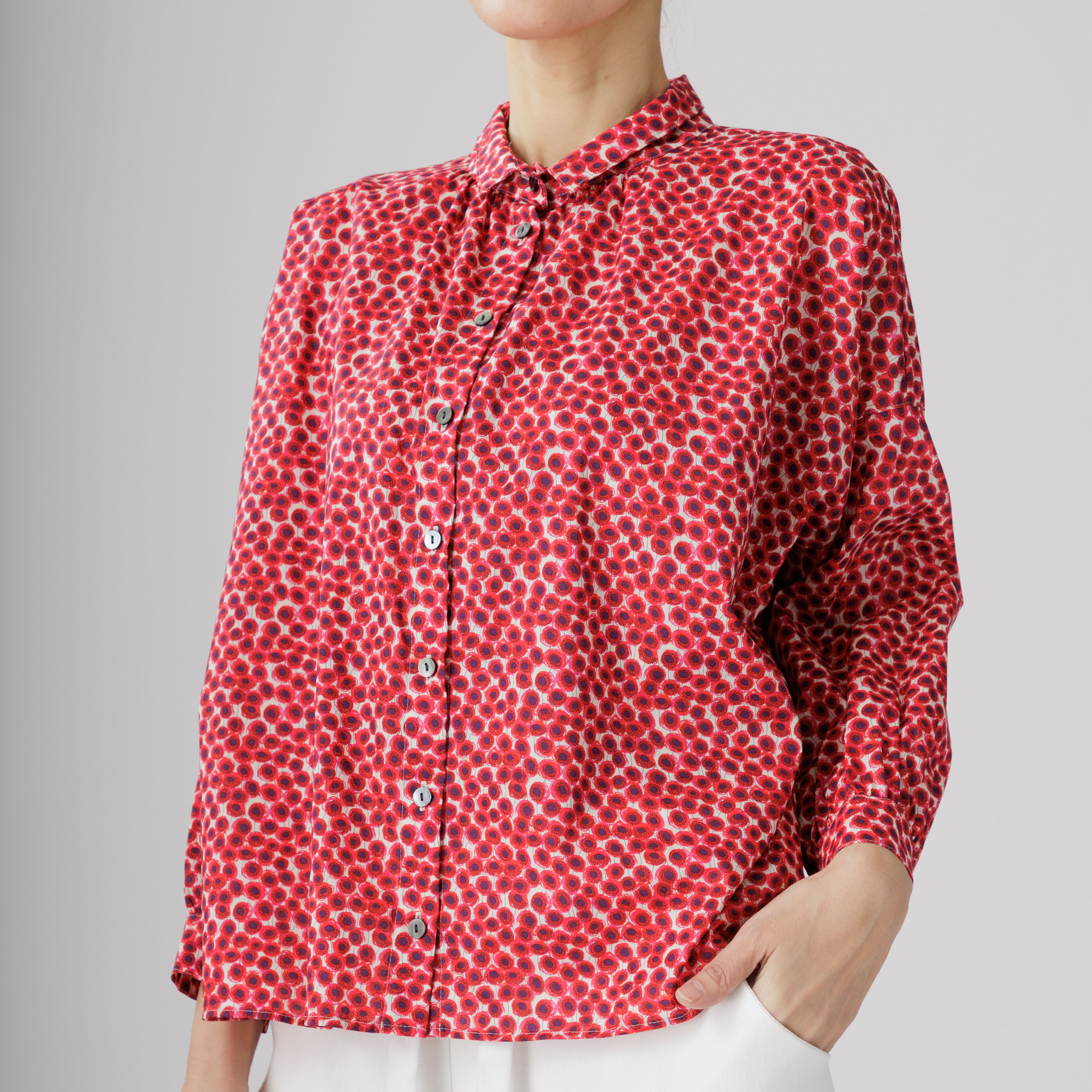 こちらは華やかなプリントが魅力の可憐なブラウス。