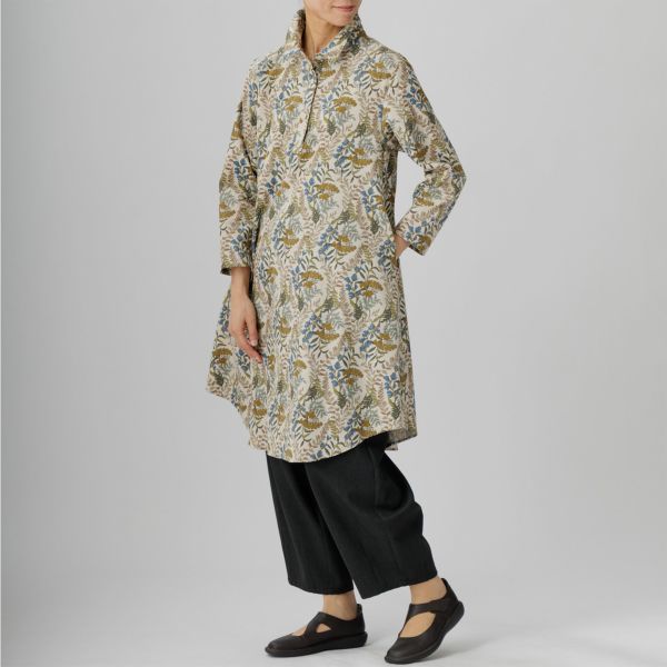 秋の装いにふさわしい味わい深い色彩の草花柄プリントを施した、
