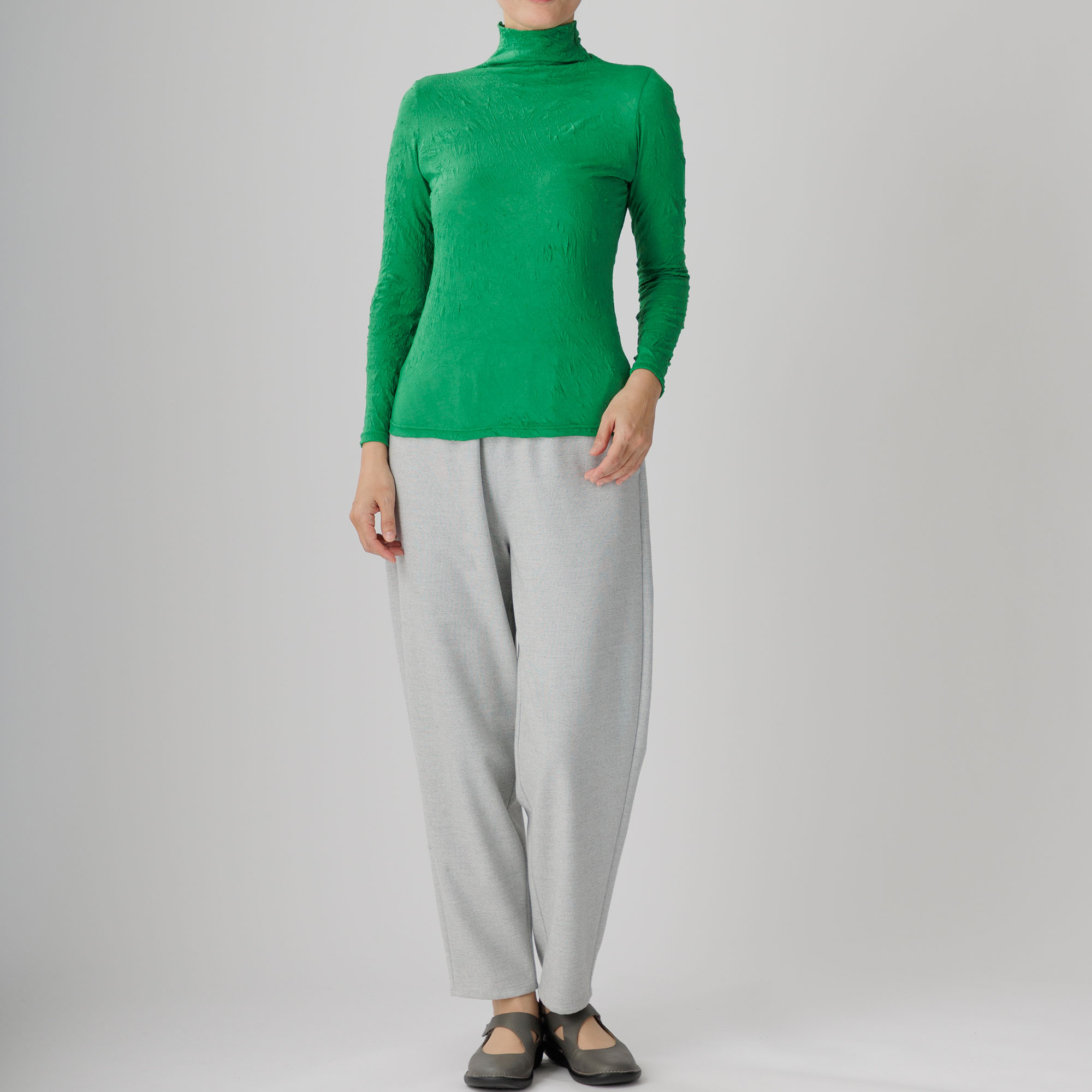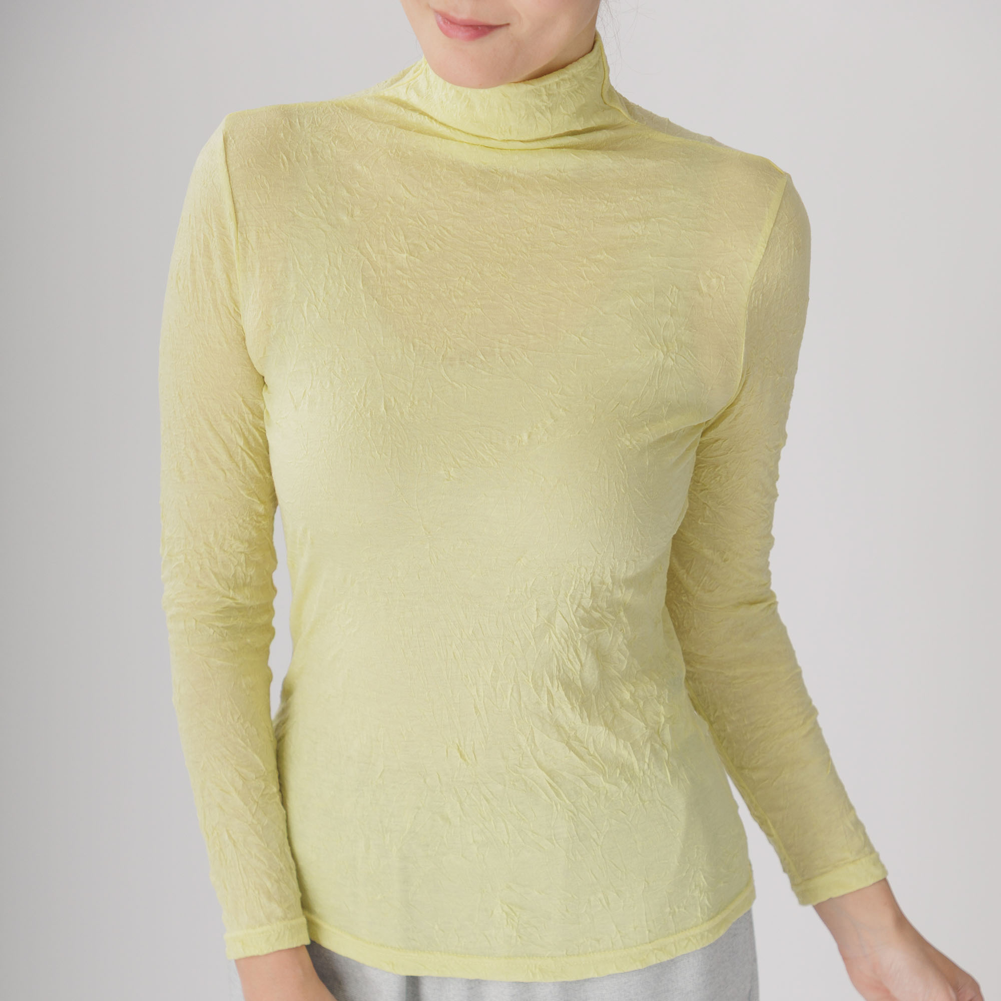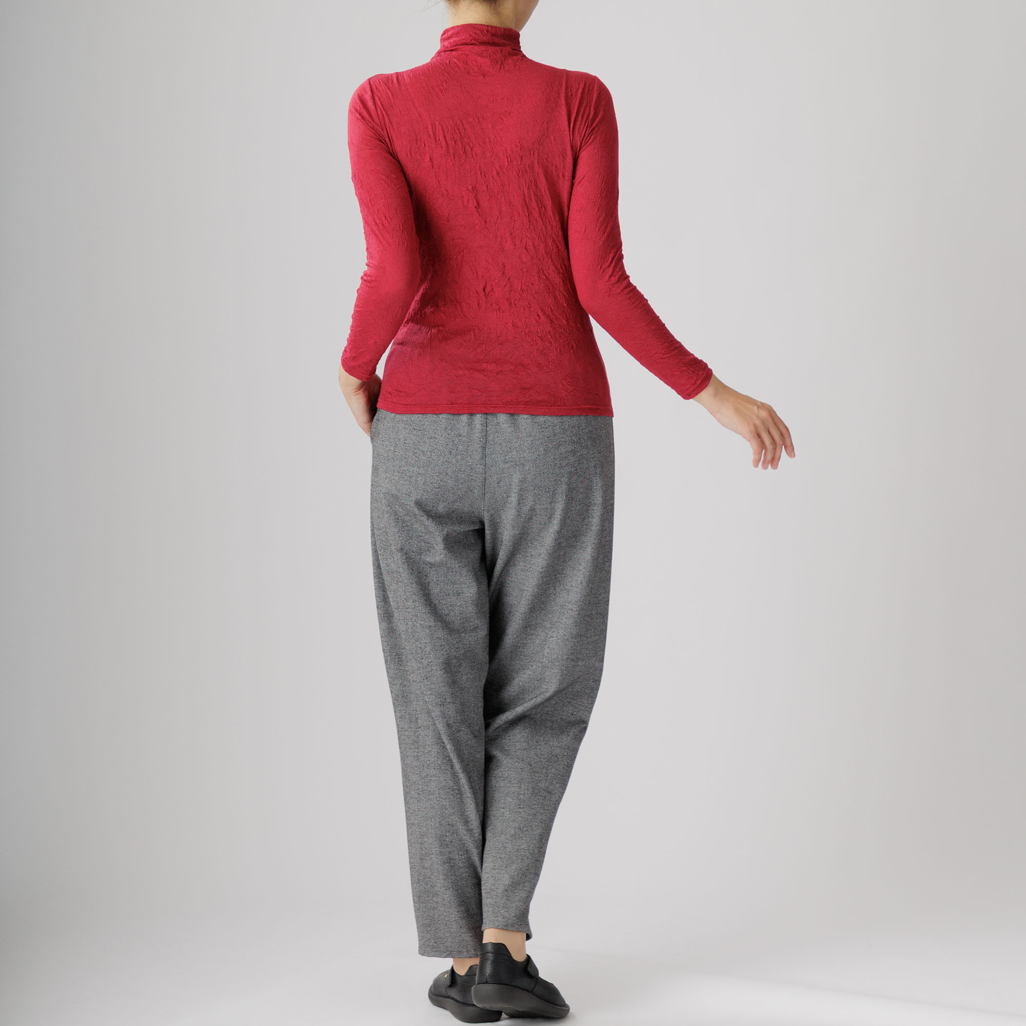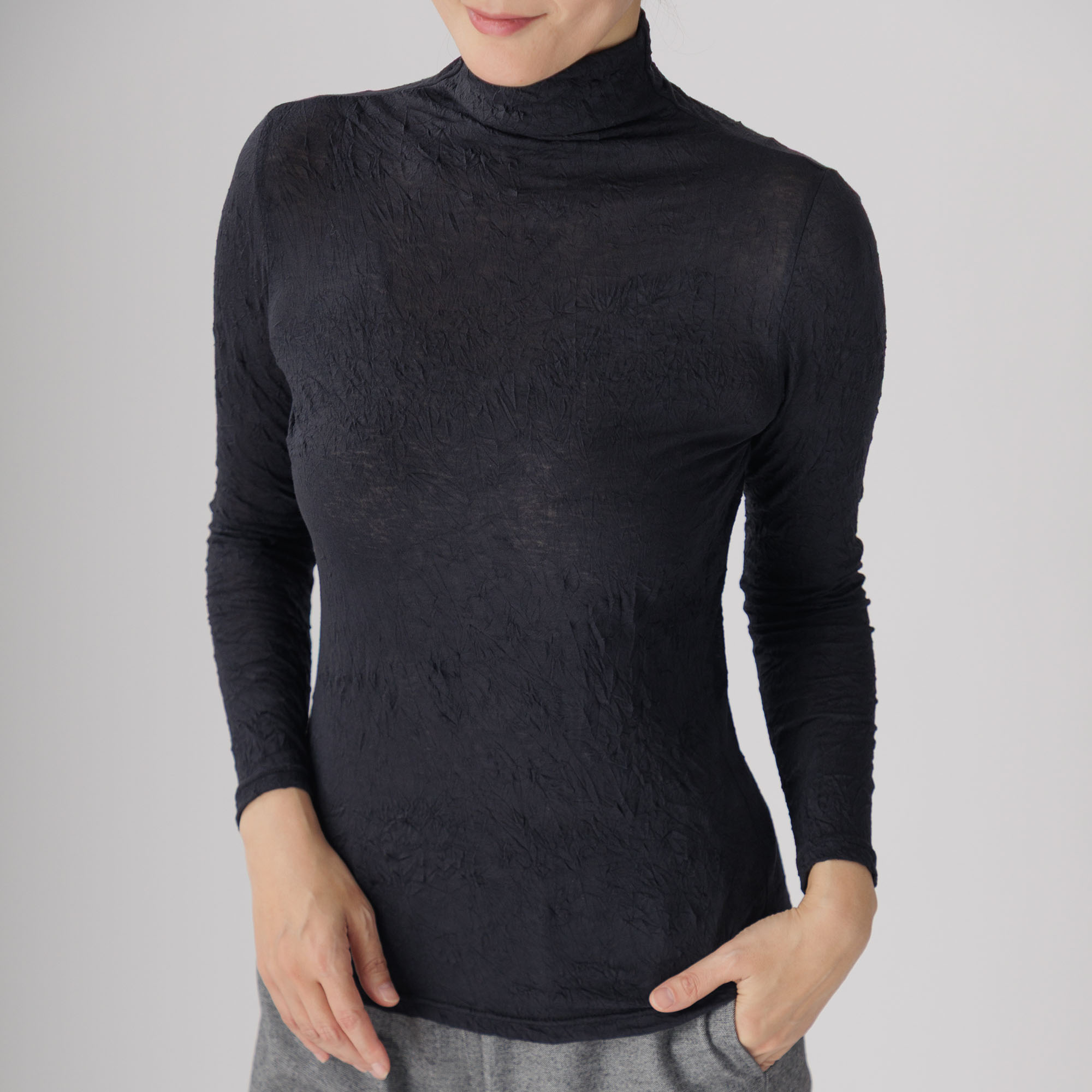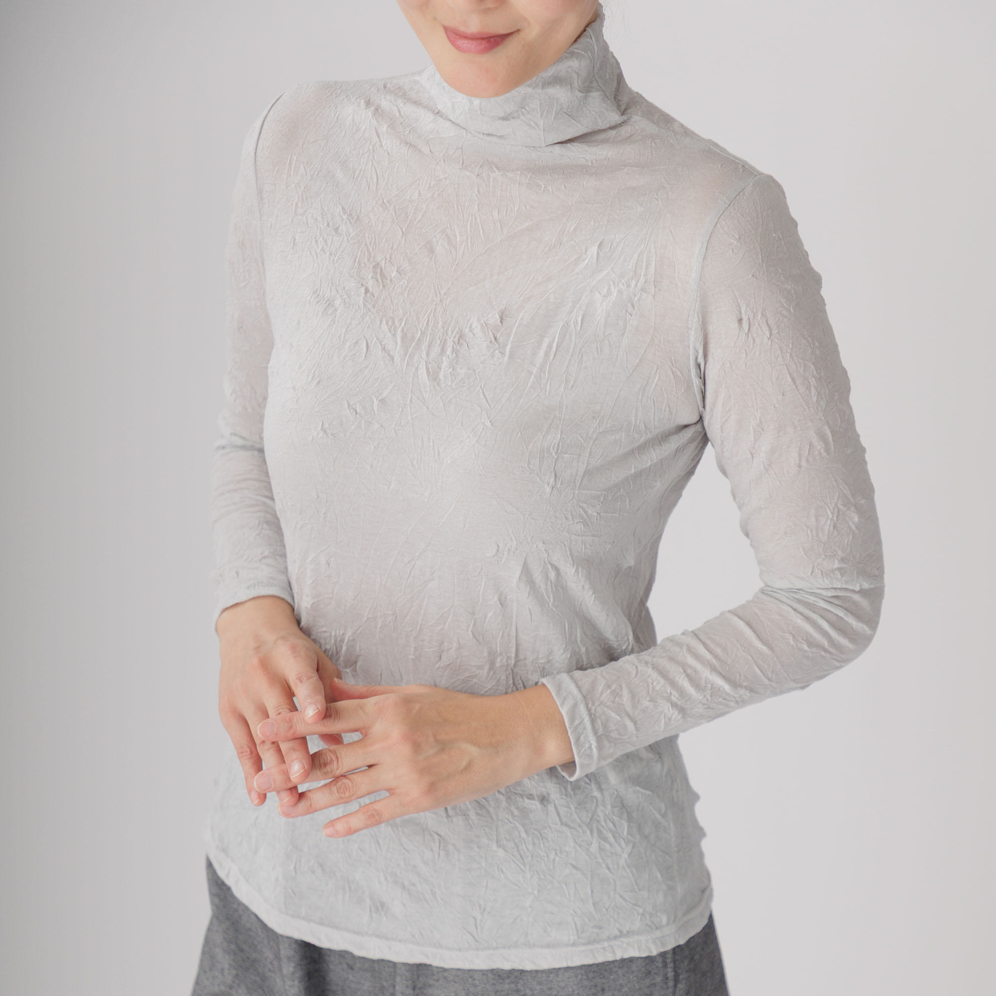 ワッシャー加工による味わい深いシワ感がセンスを放つ新作ハイネックインナーはいかがですか。
