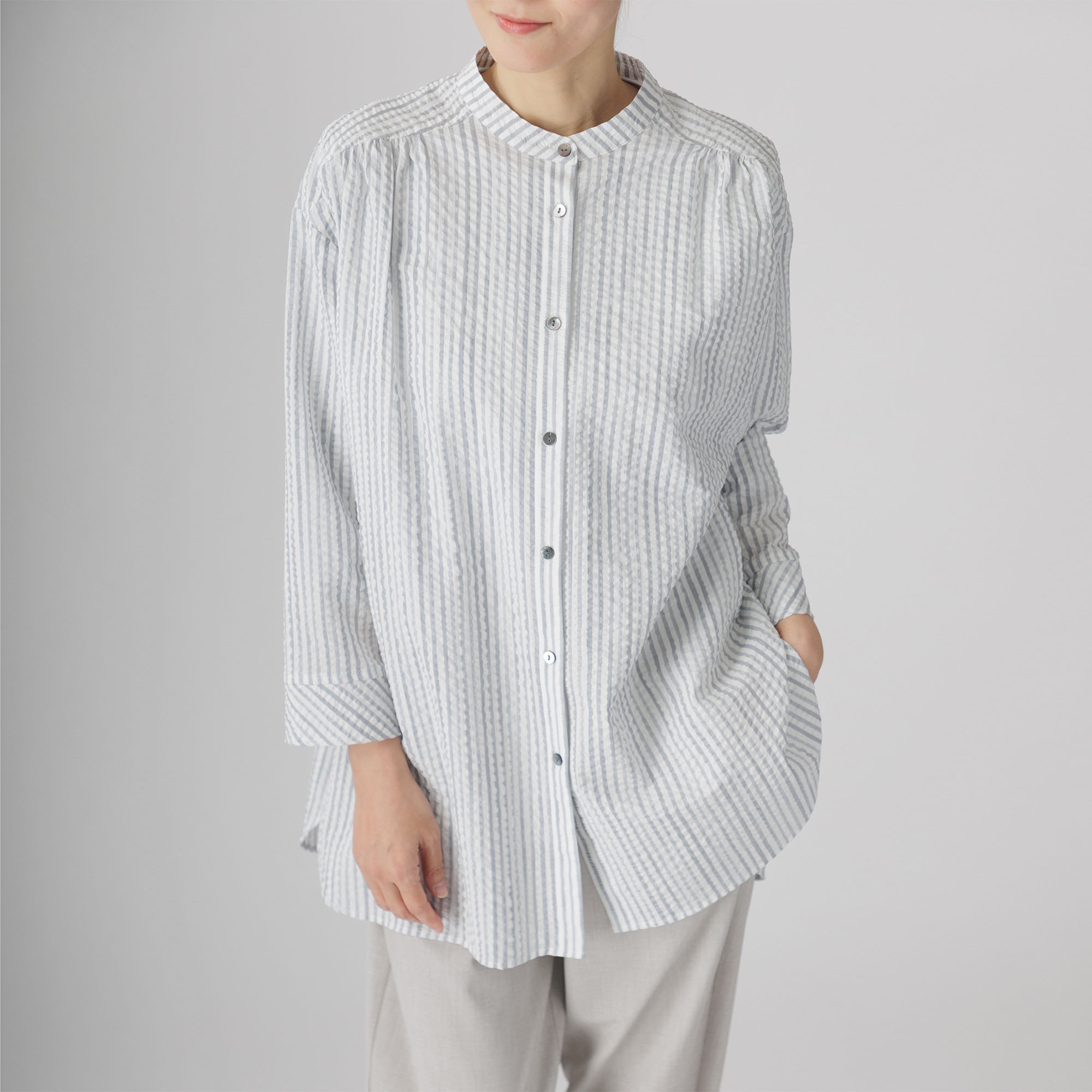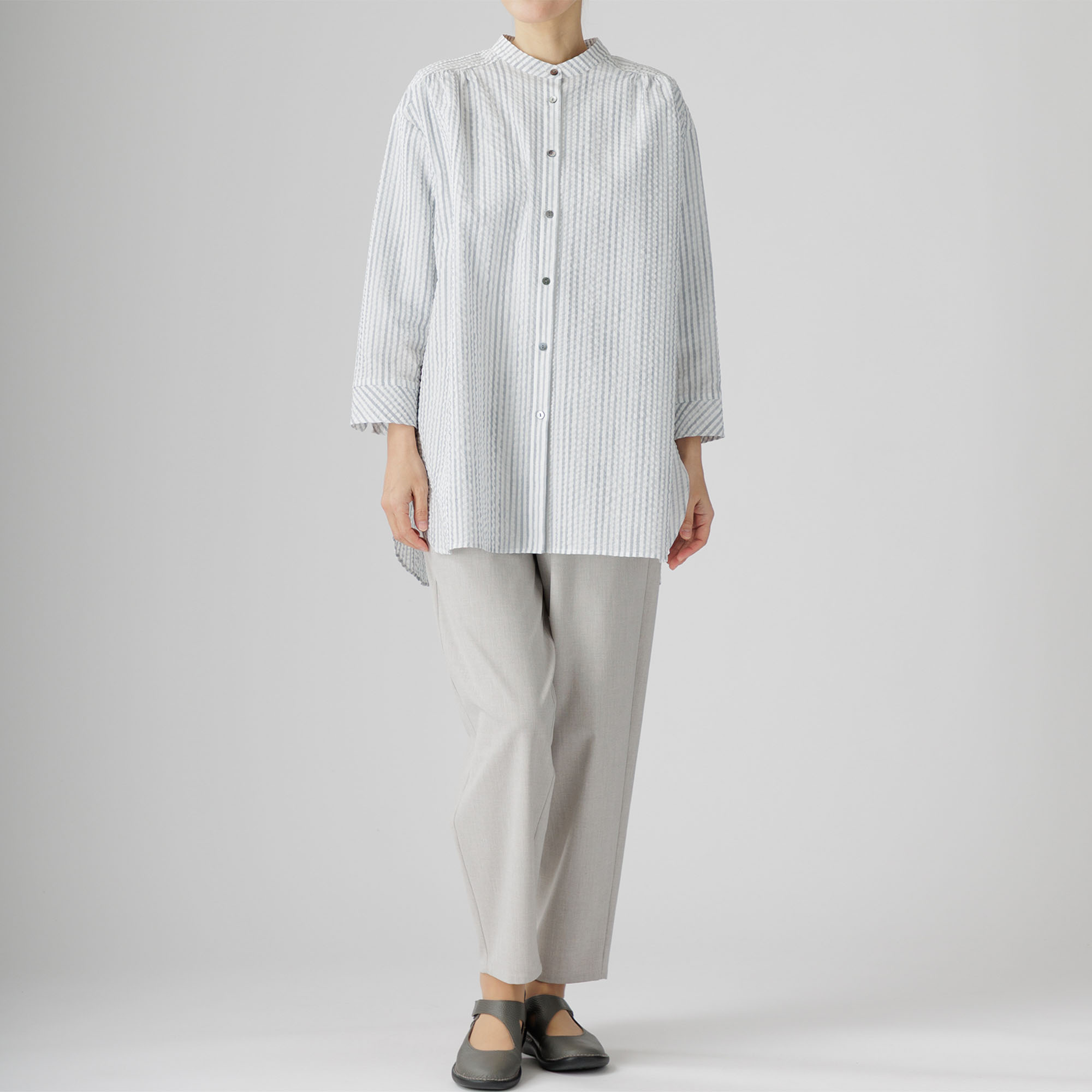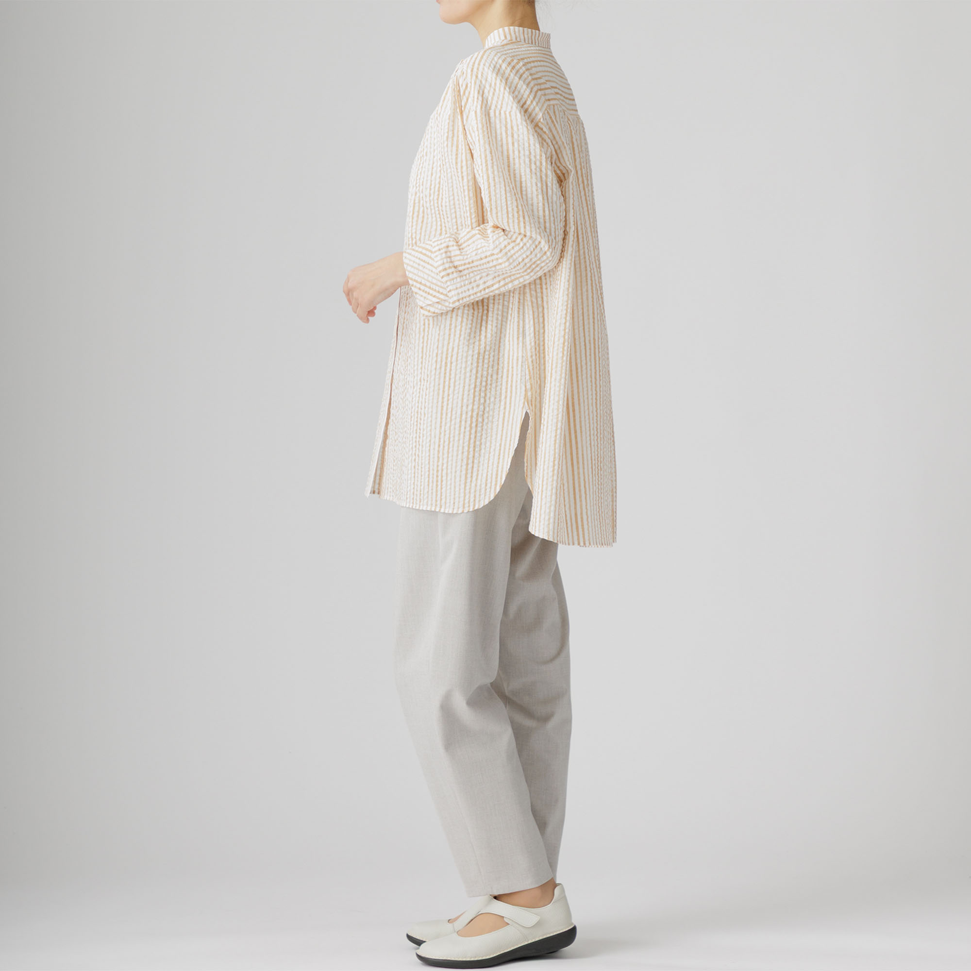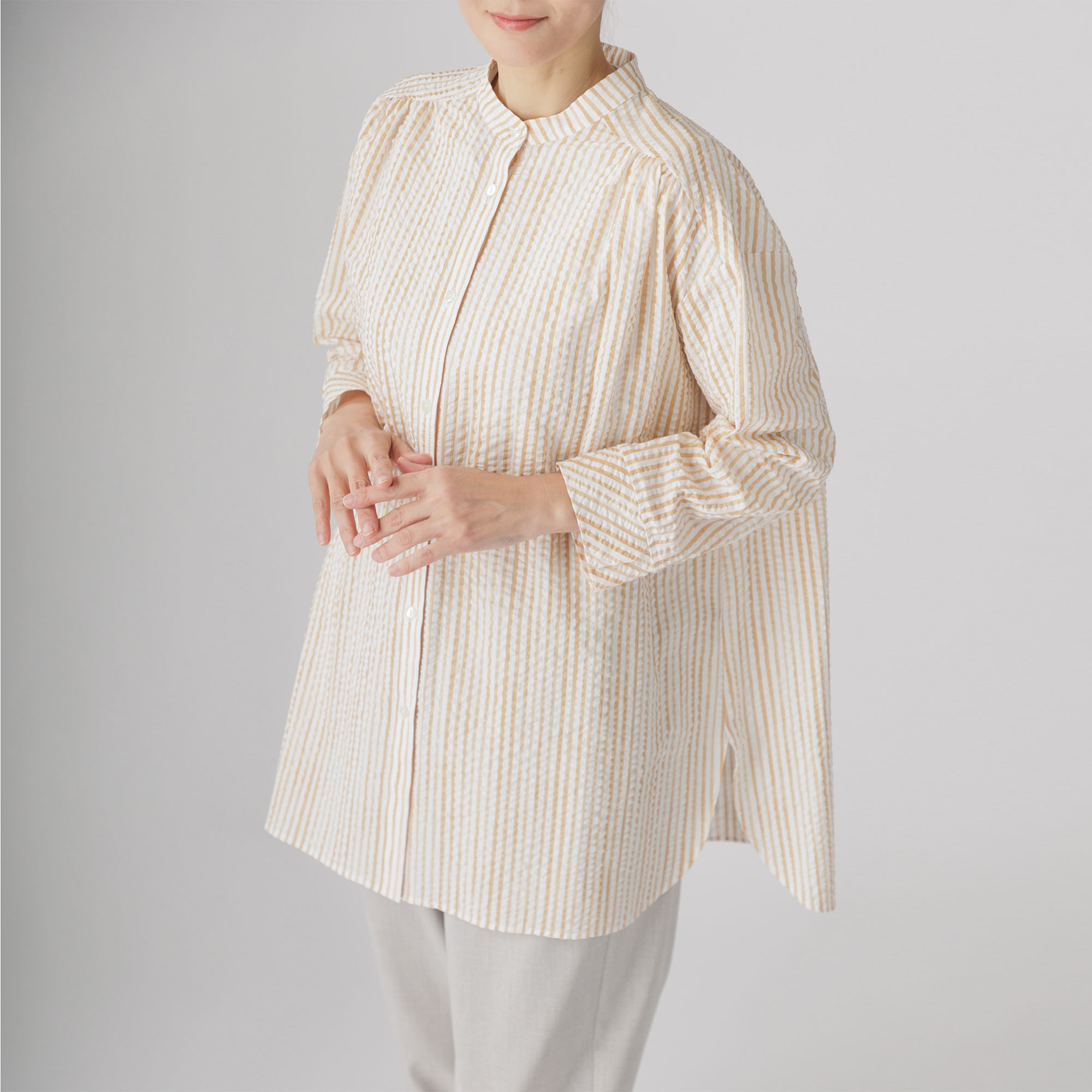 味わい深いシワ感のある生地と優しい色彩のストライプ柄が清涼感を放ち、麗らかな季節の装いに最適。
