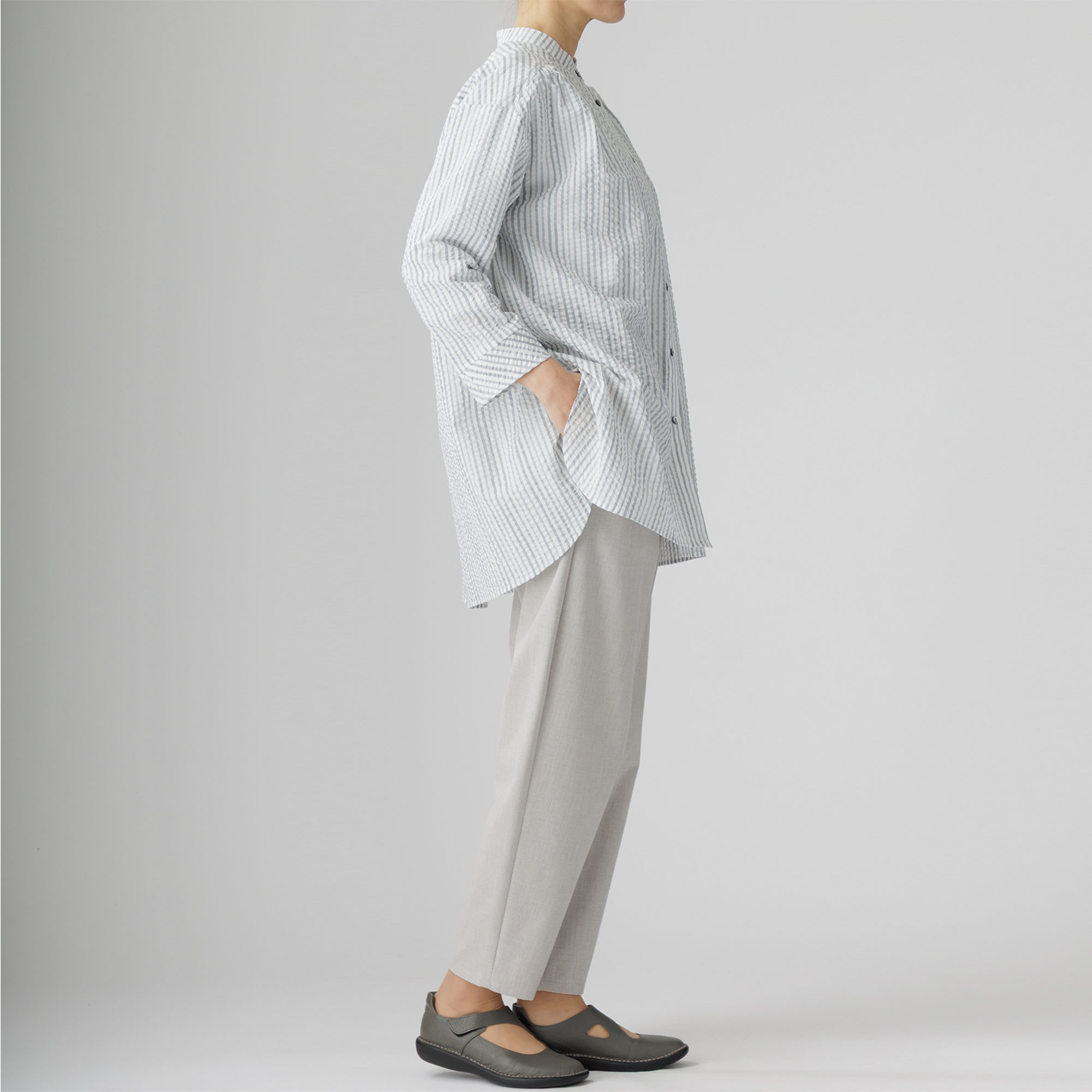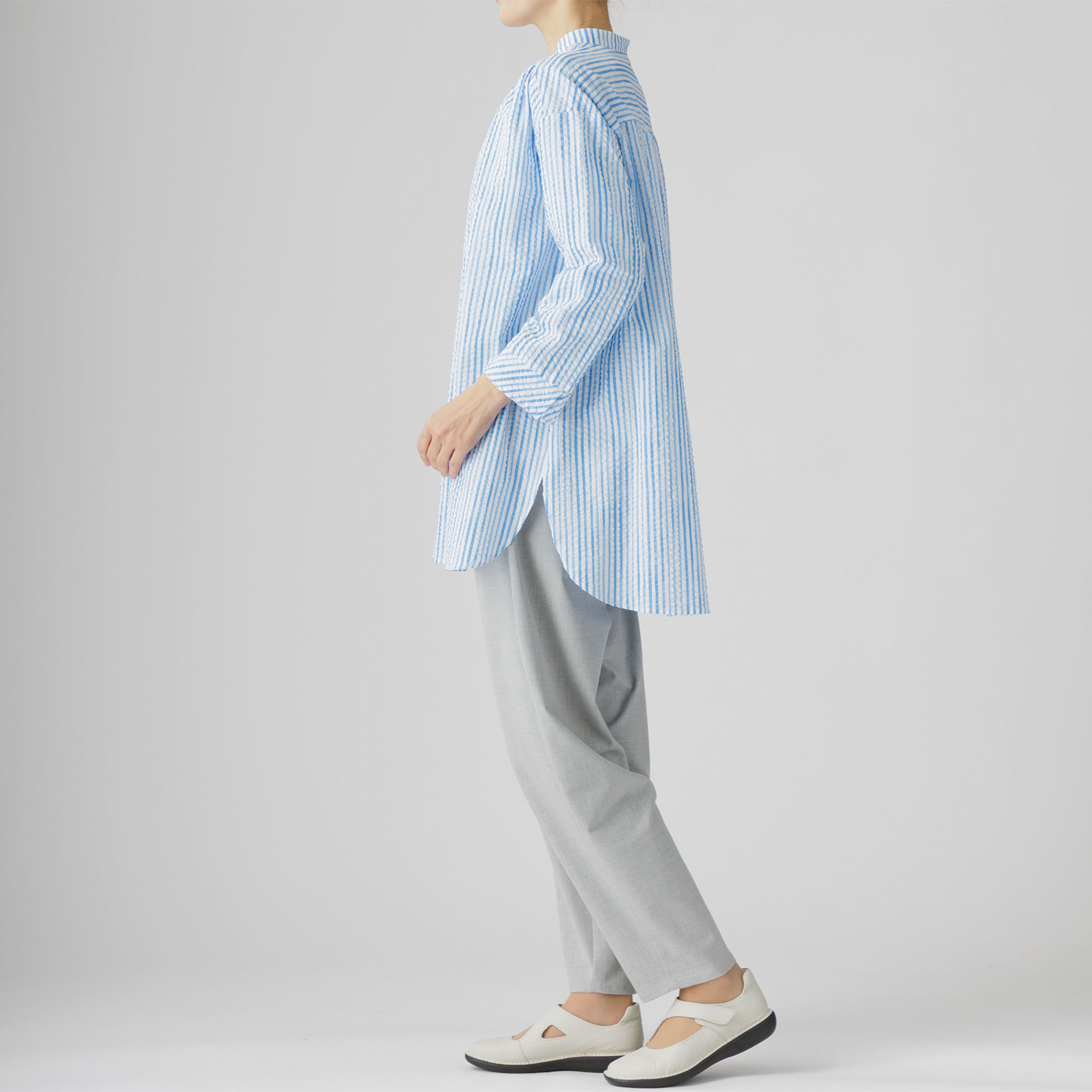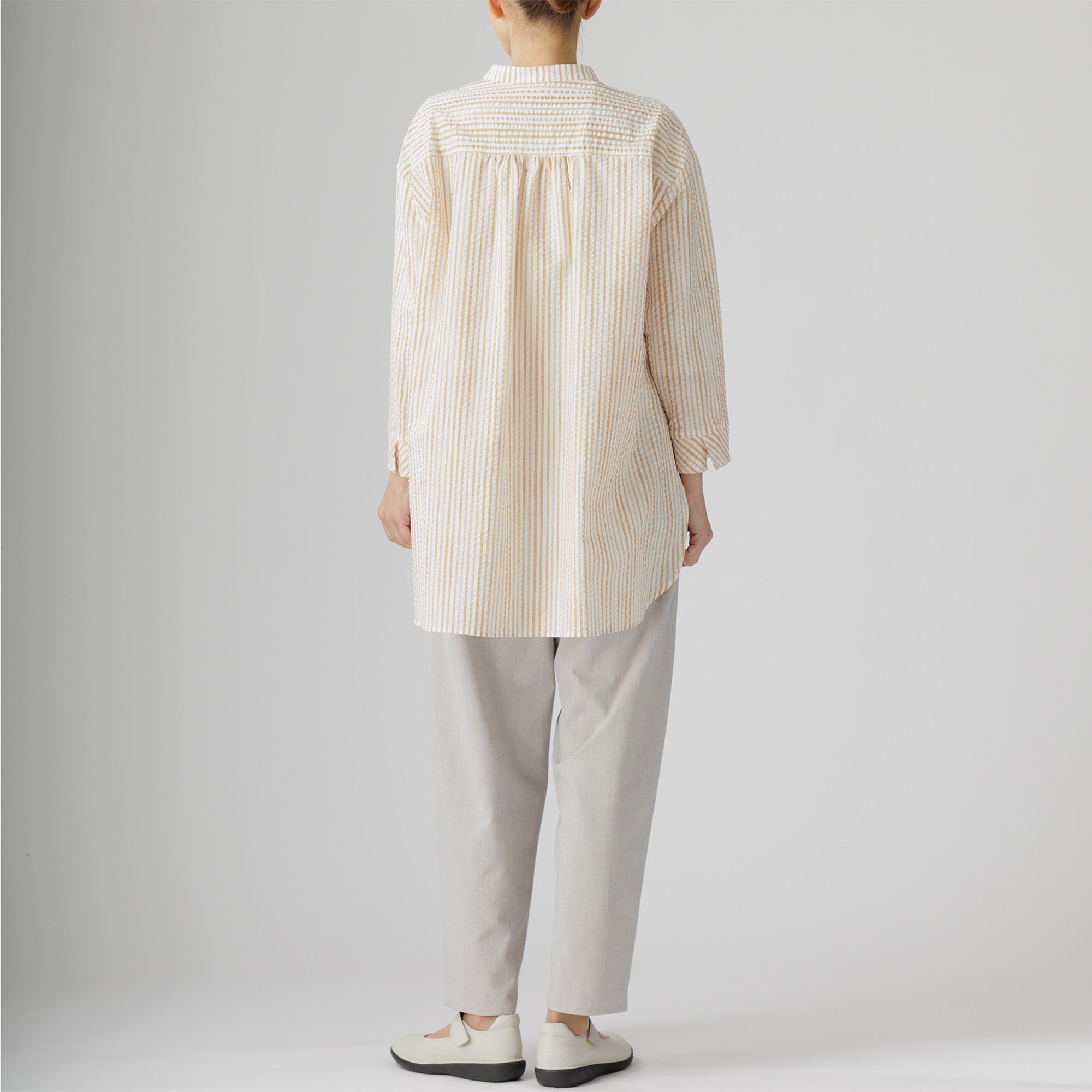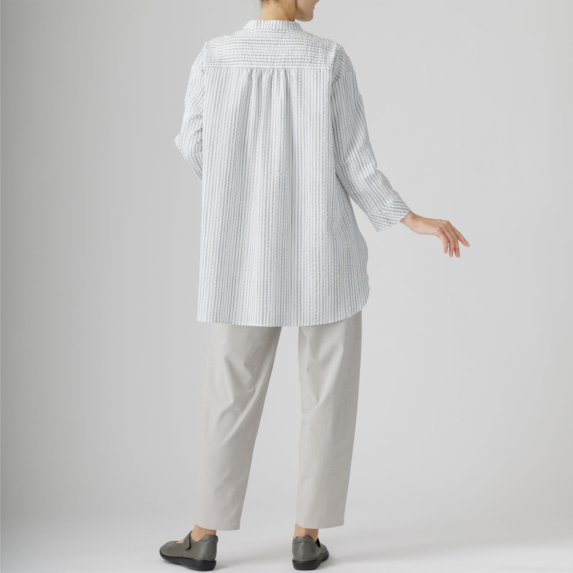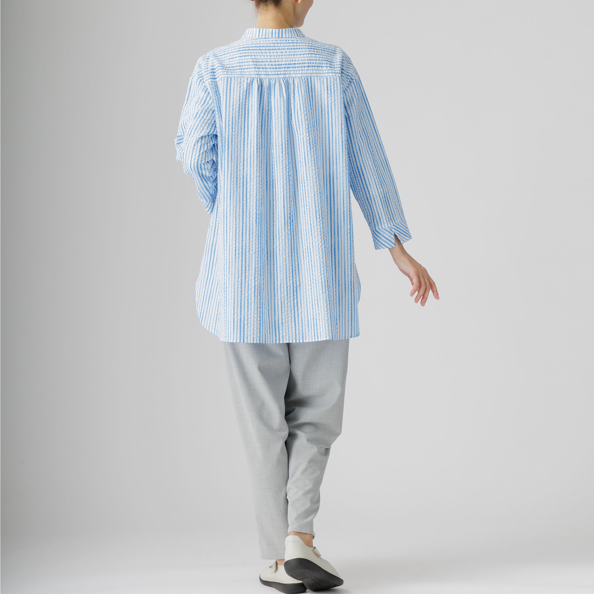 味わい深いシワ感のある生地と優しい色彩のストライプ柄が清涼感を放ち、麗らかな季節の装いに最適。