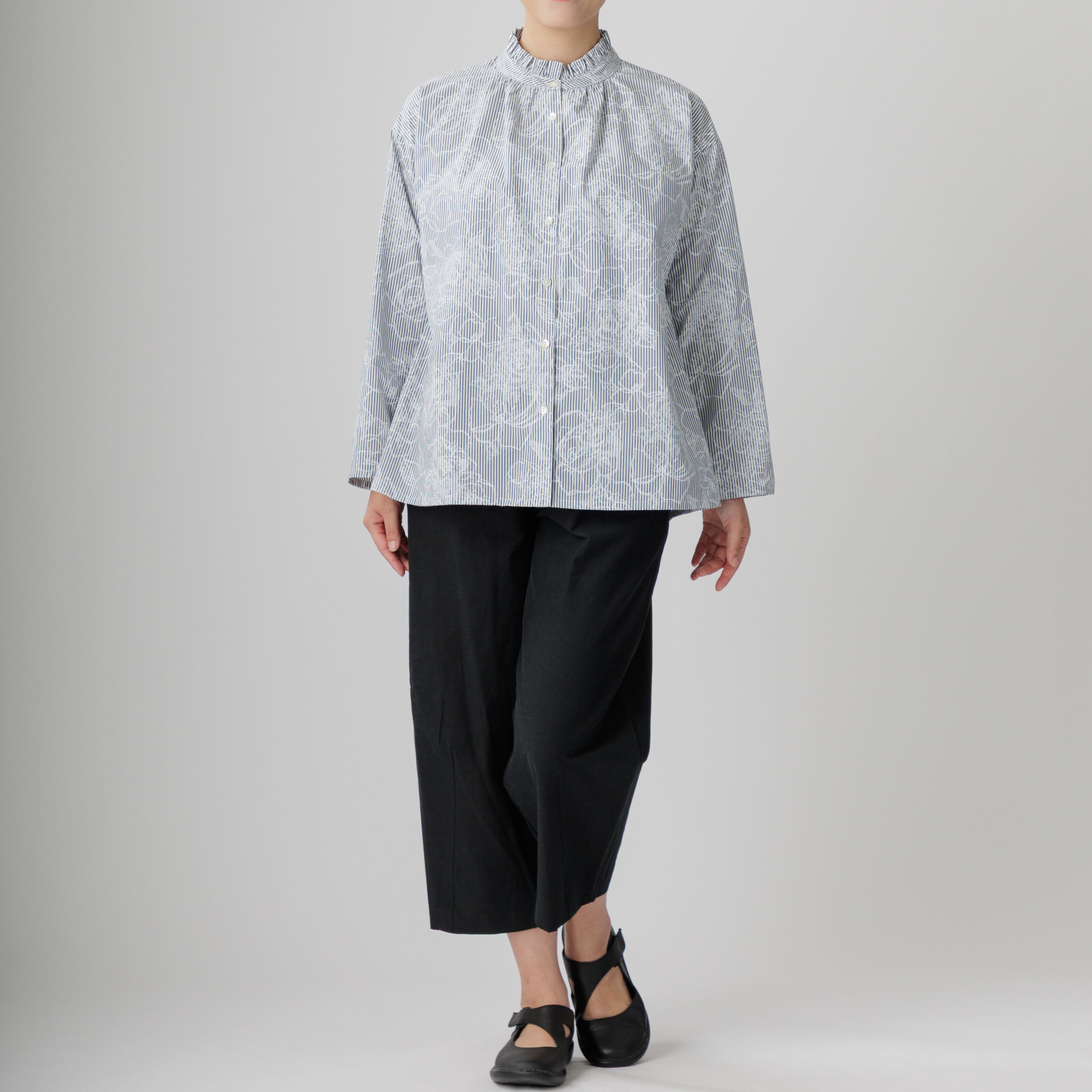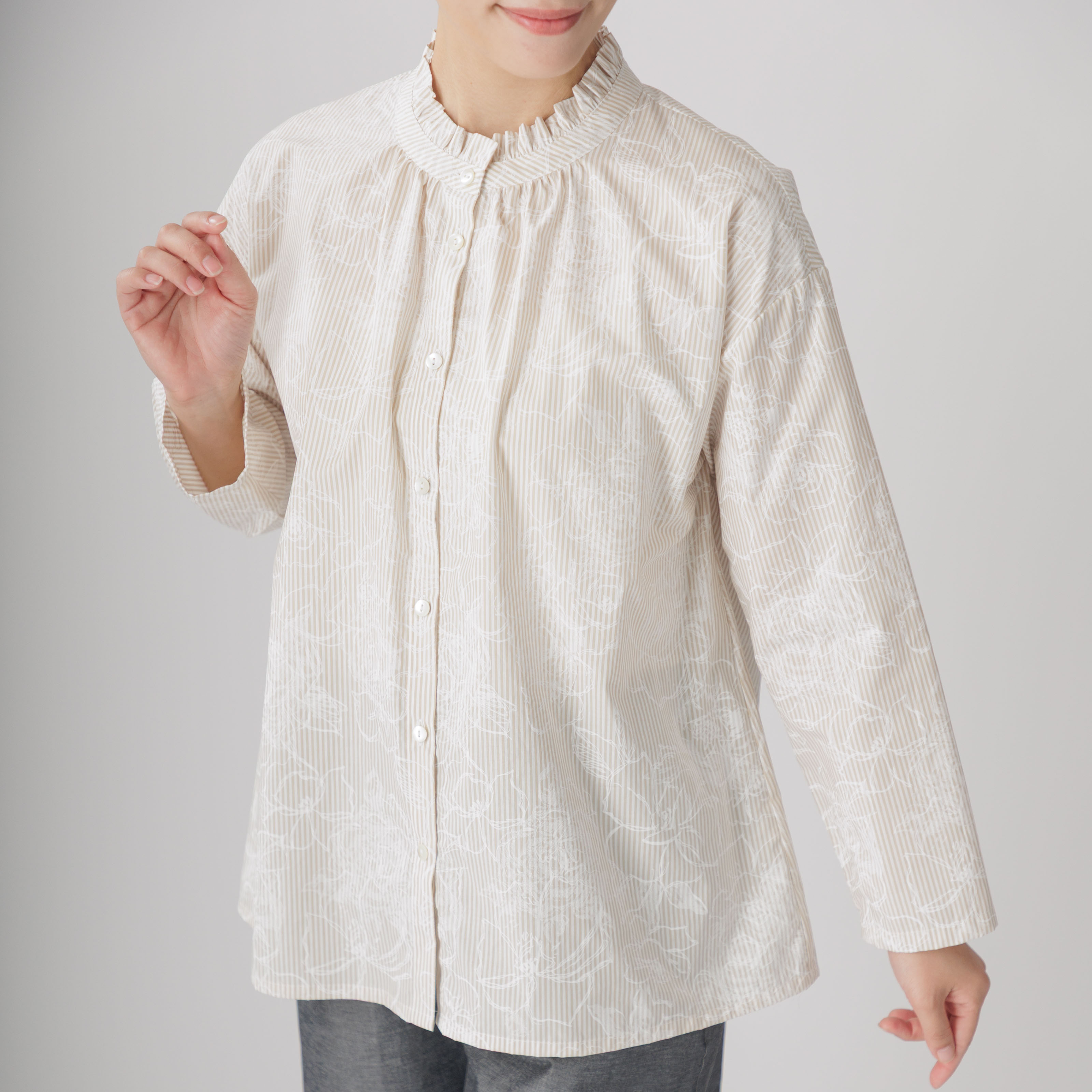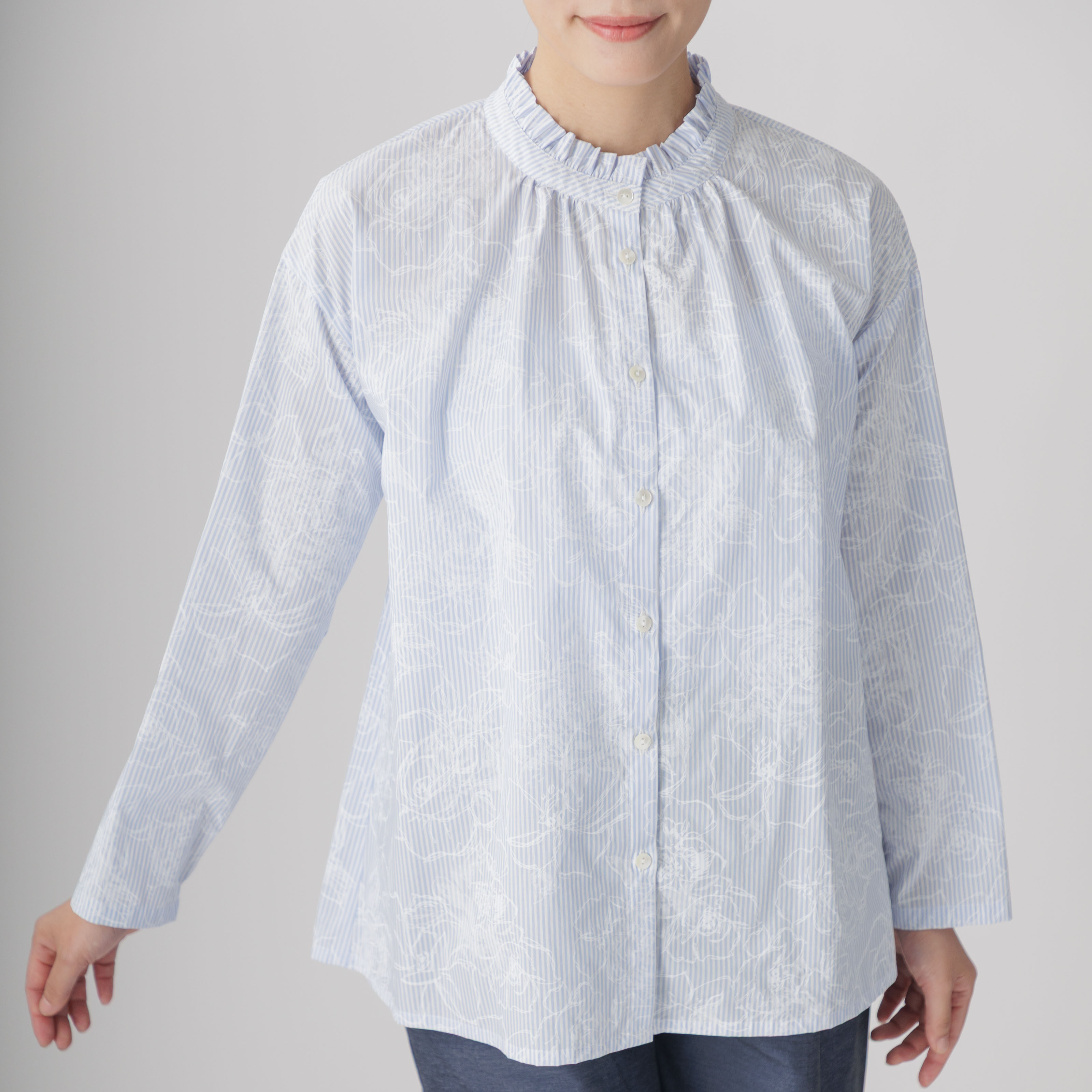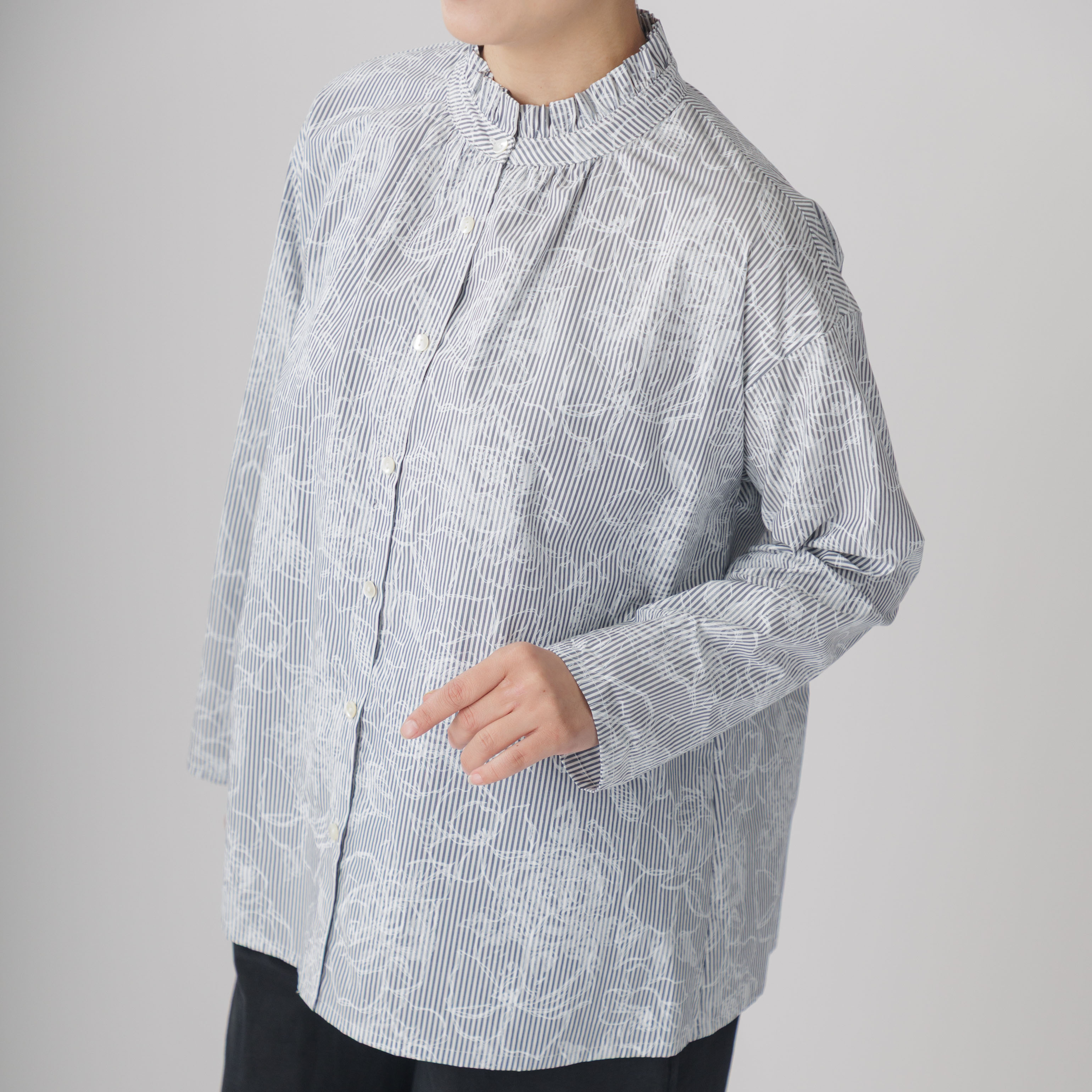 綿100%のストライプ生地に素朴な花柄をプリントした新作ブラウスはいかがですか。