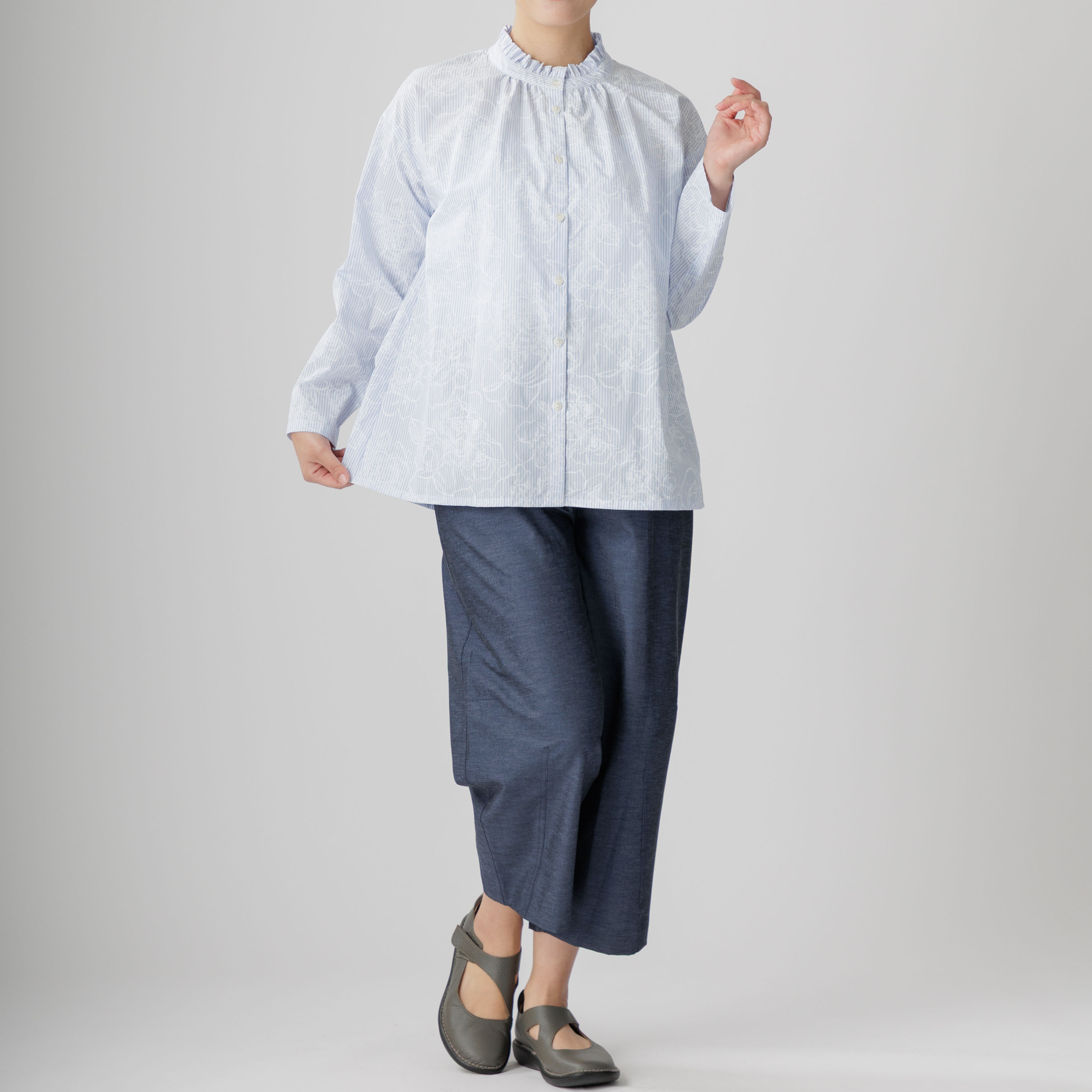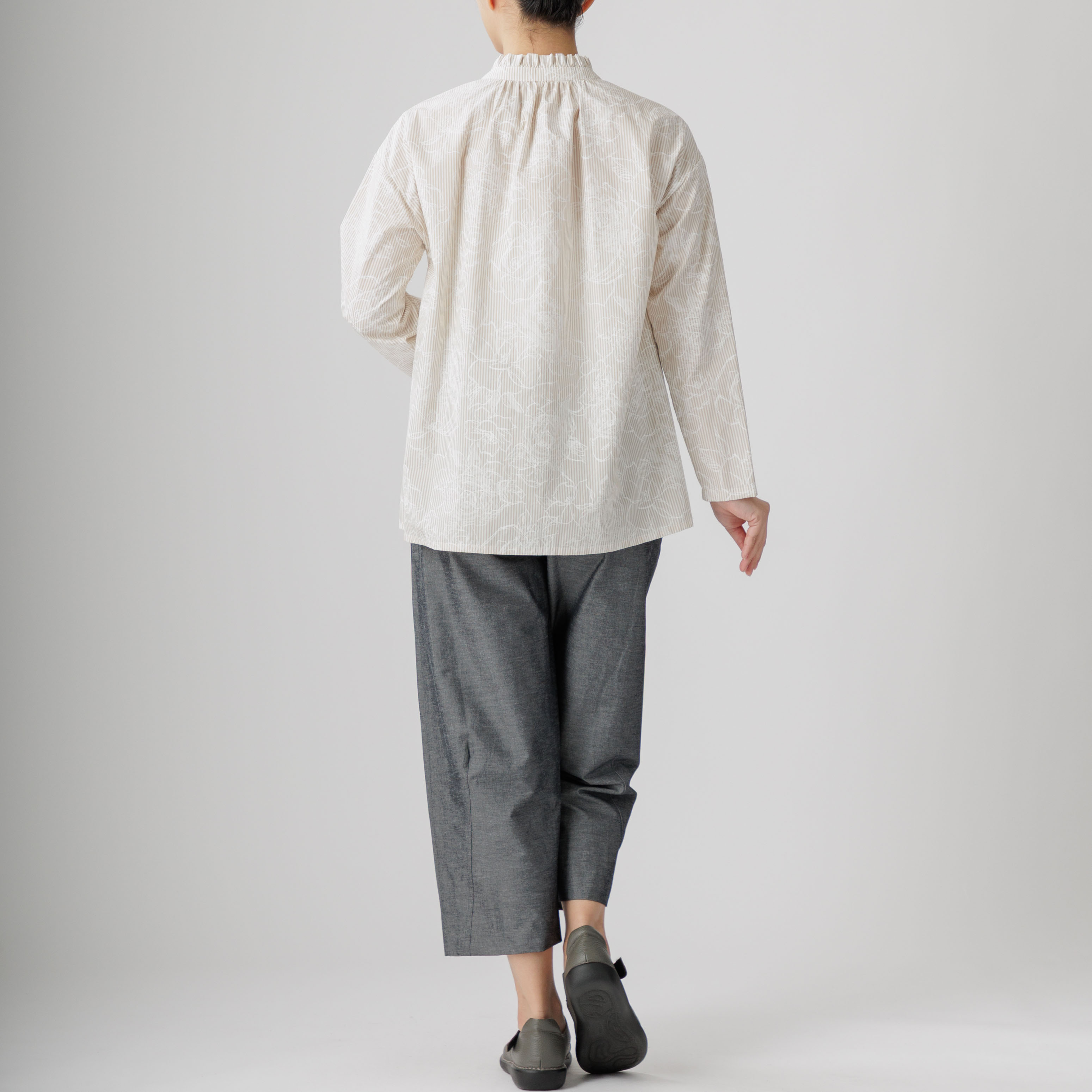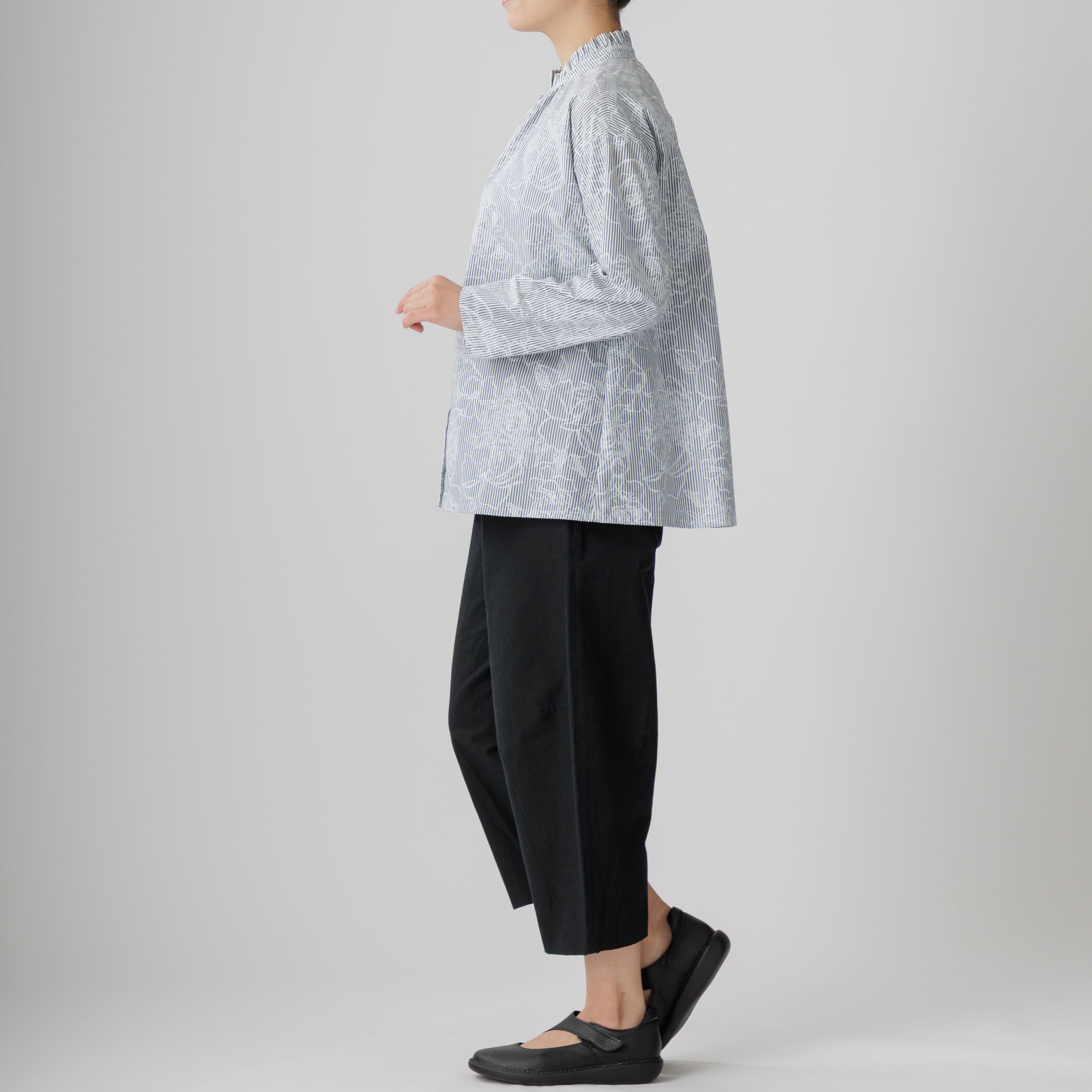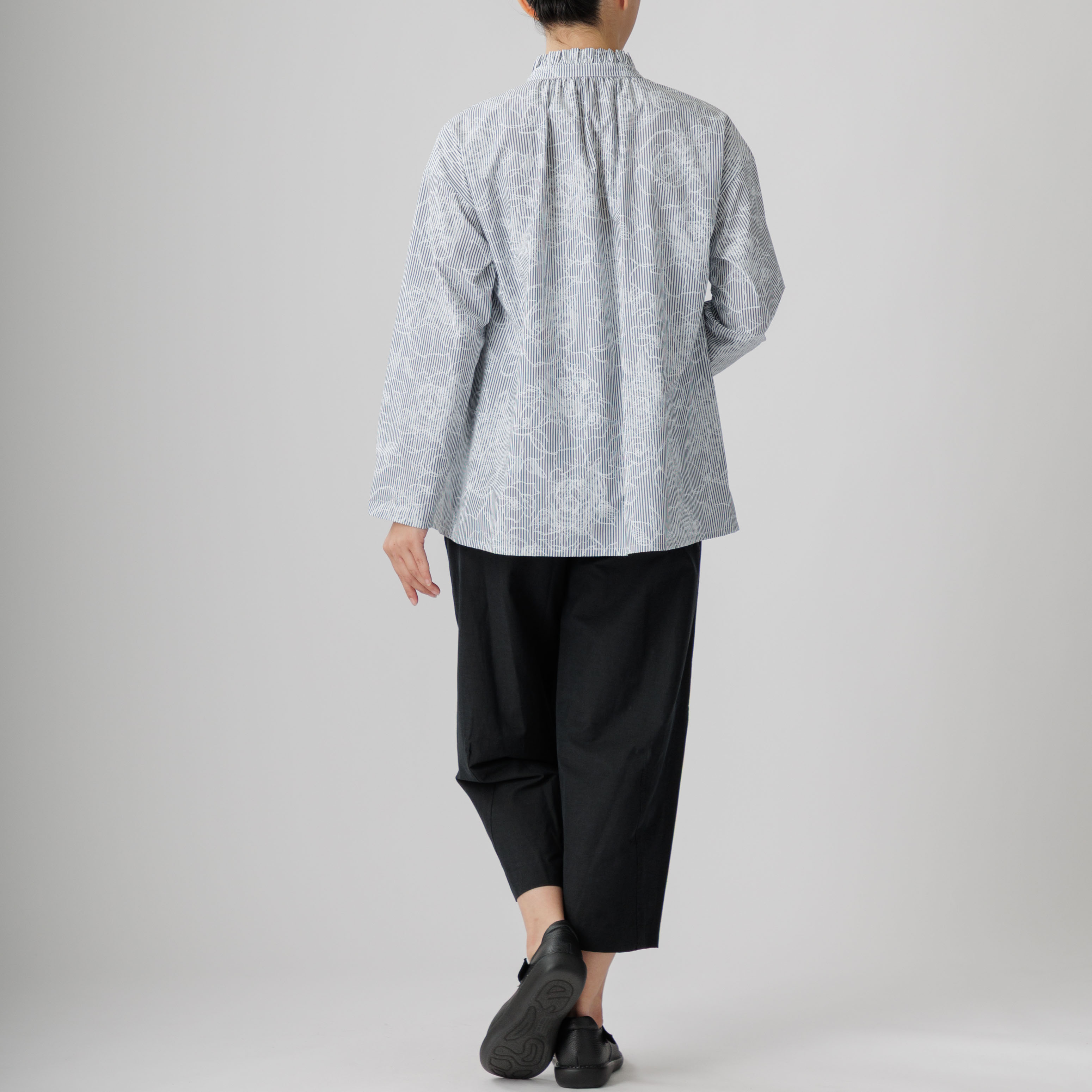 綿100%のストライプ生地に素朴な花柄をプリントした新作ブラウスはいかがですか。