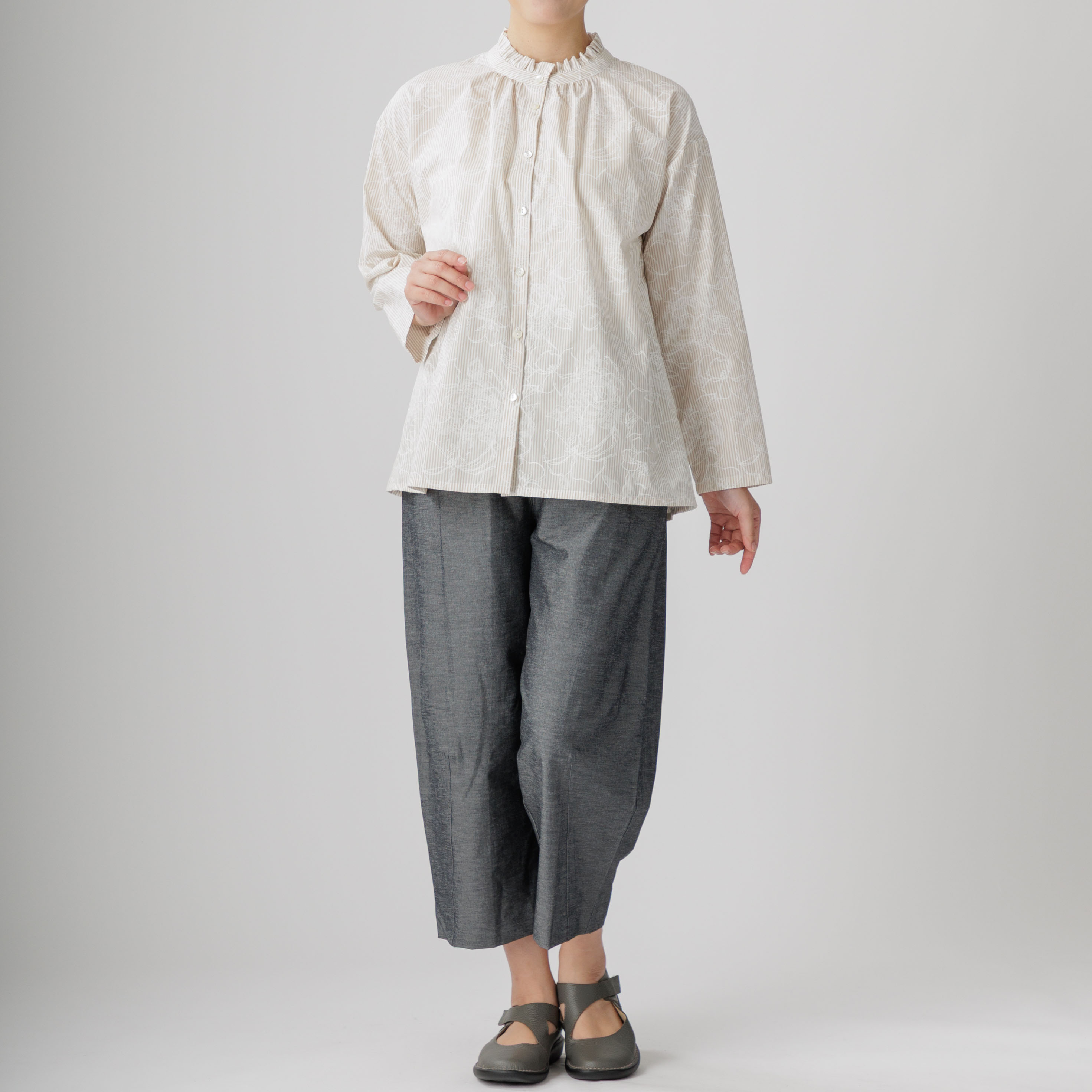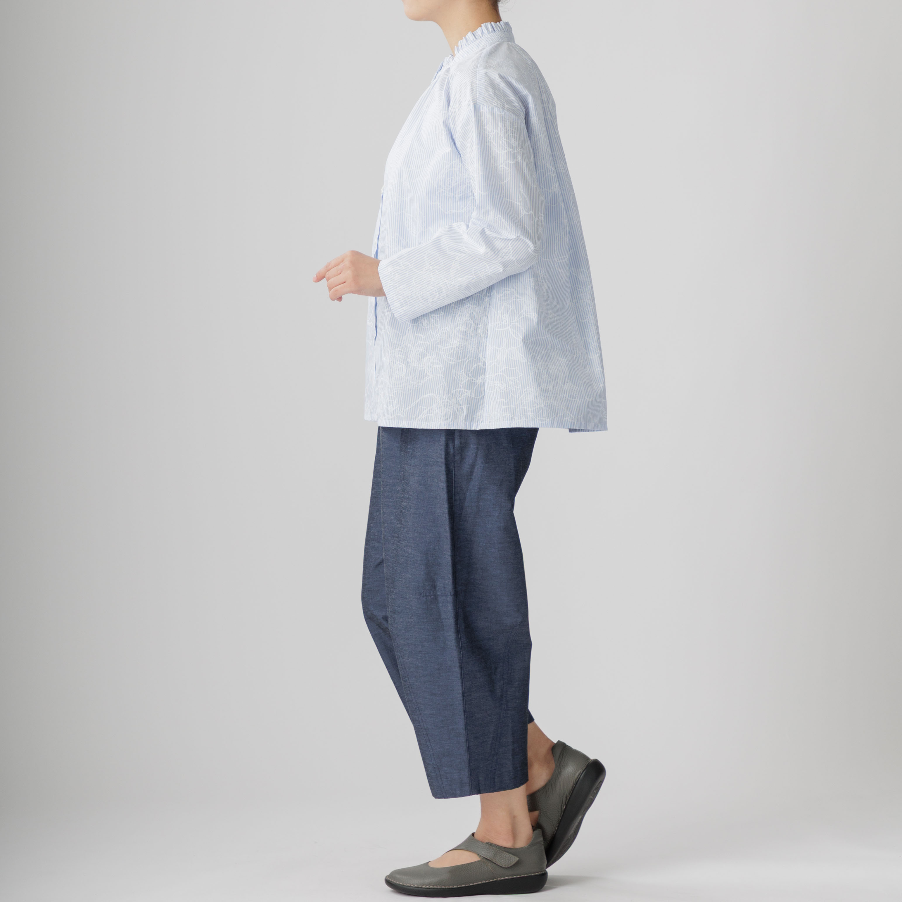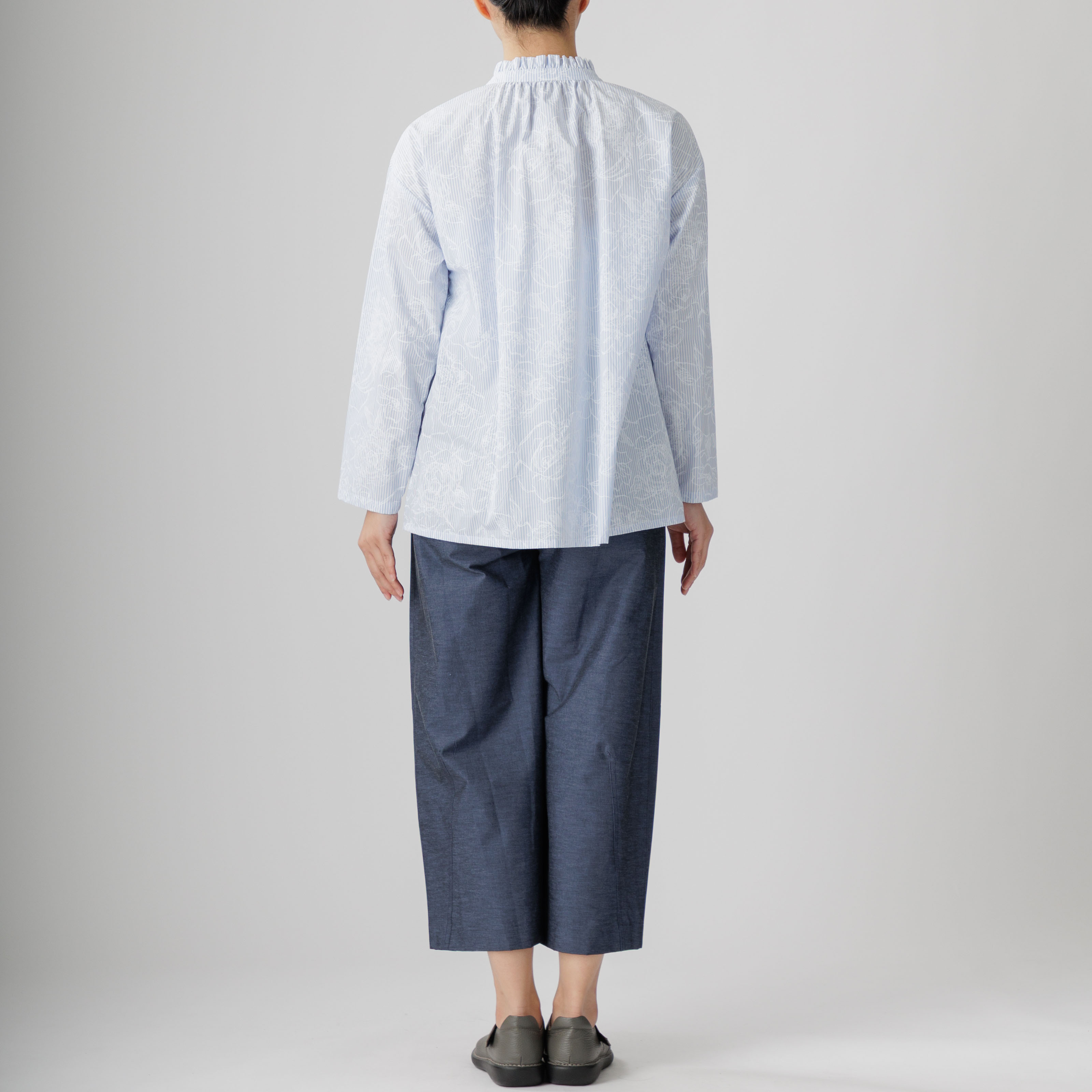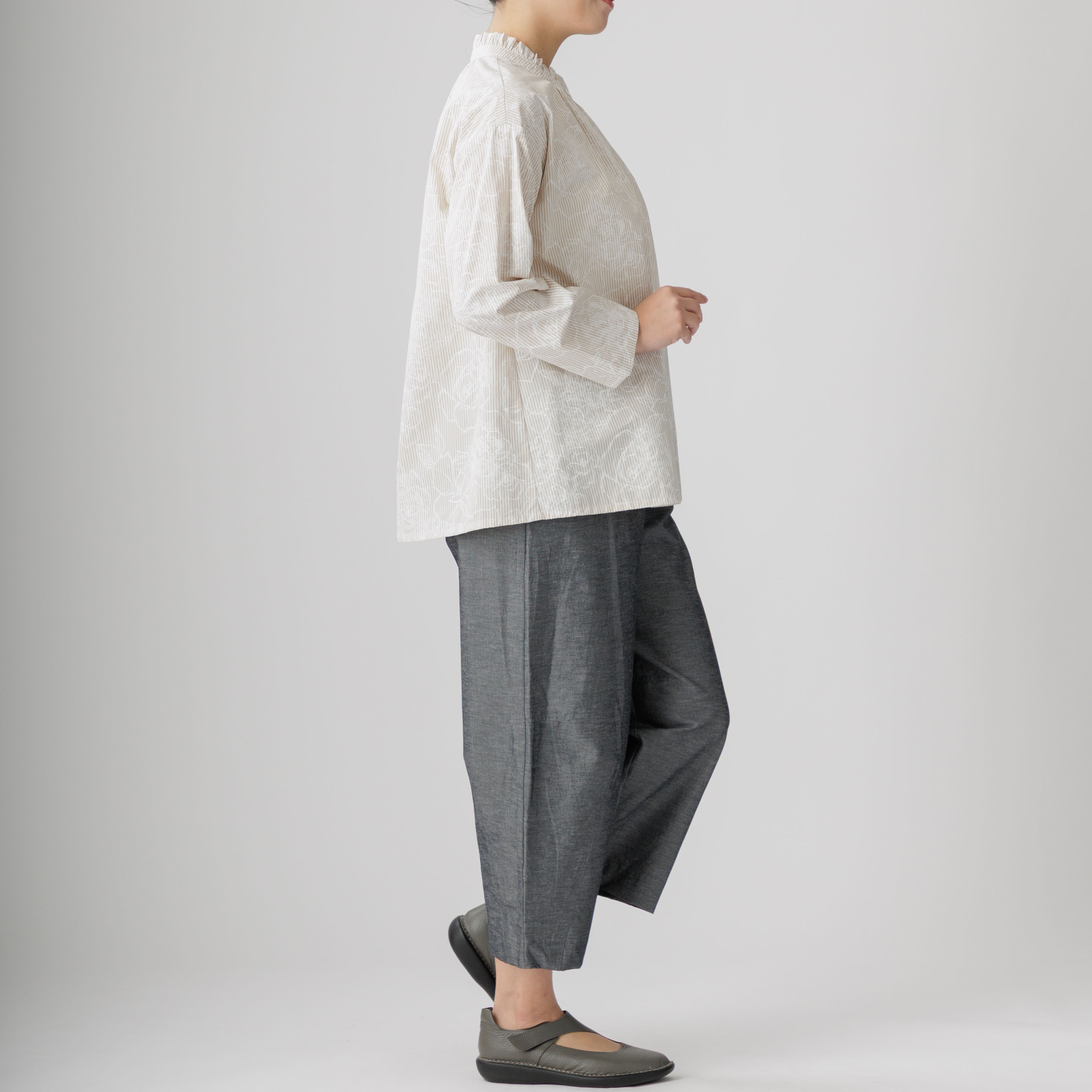 綿100%のストライプ生地に素朴な花柄をプリントした新作ブラウスはいかがですか。
