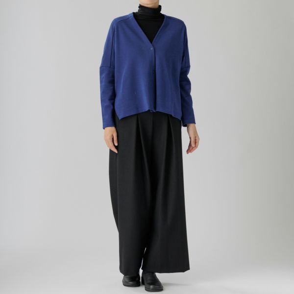 深く切れ込んだVネックと裾脇のVラインがスタイリッシュな着姿を作り、
