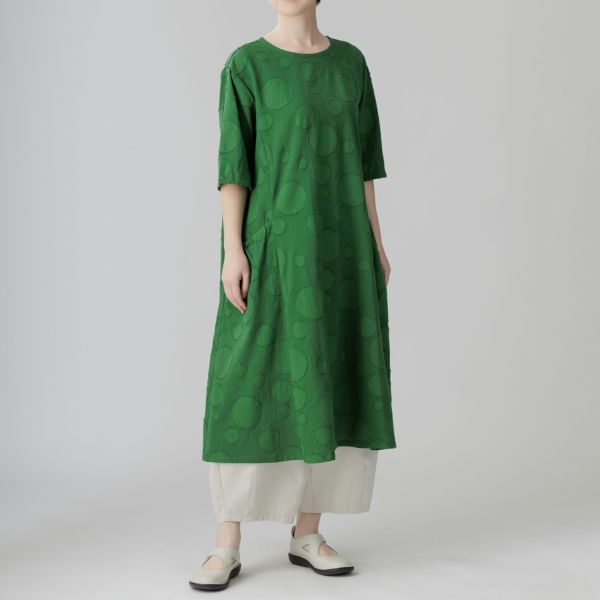 手の込んだ水玉模様のジャガードで高い質感をお楽しみいただける綿麻のワンピースはいかがですか。