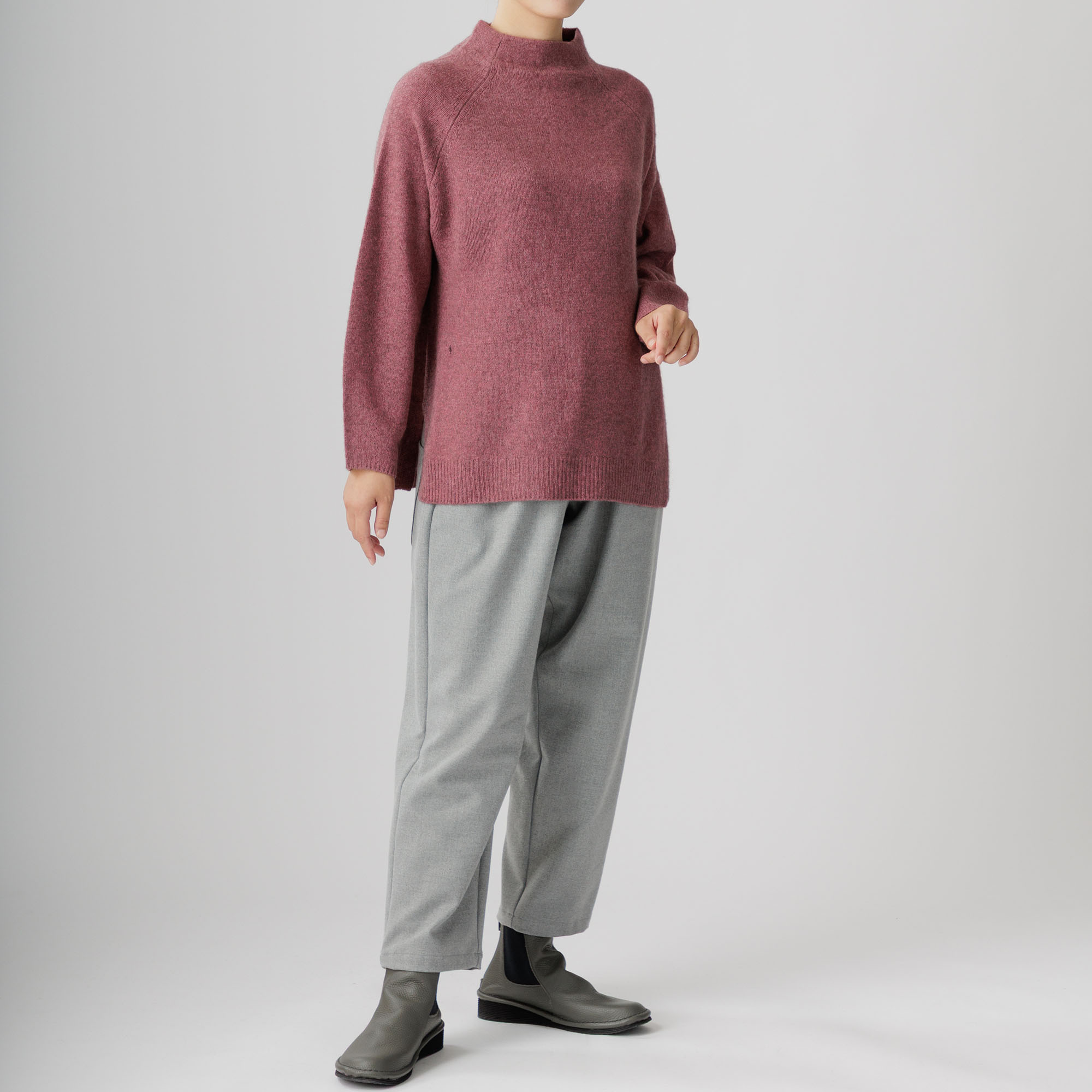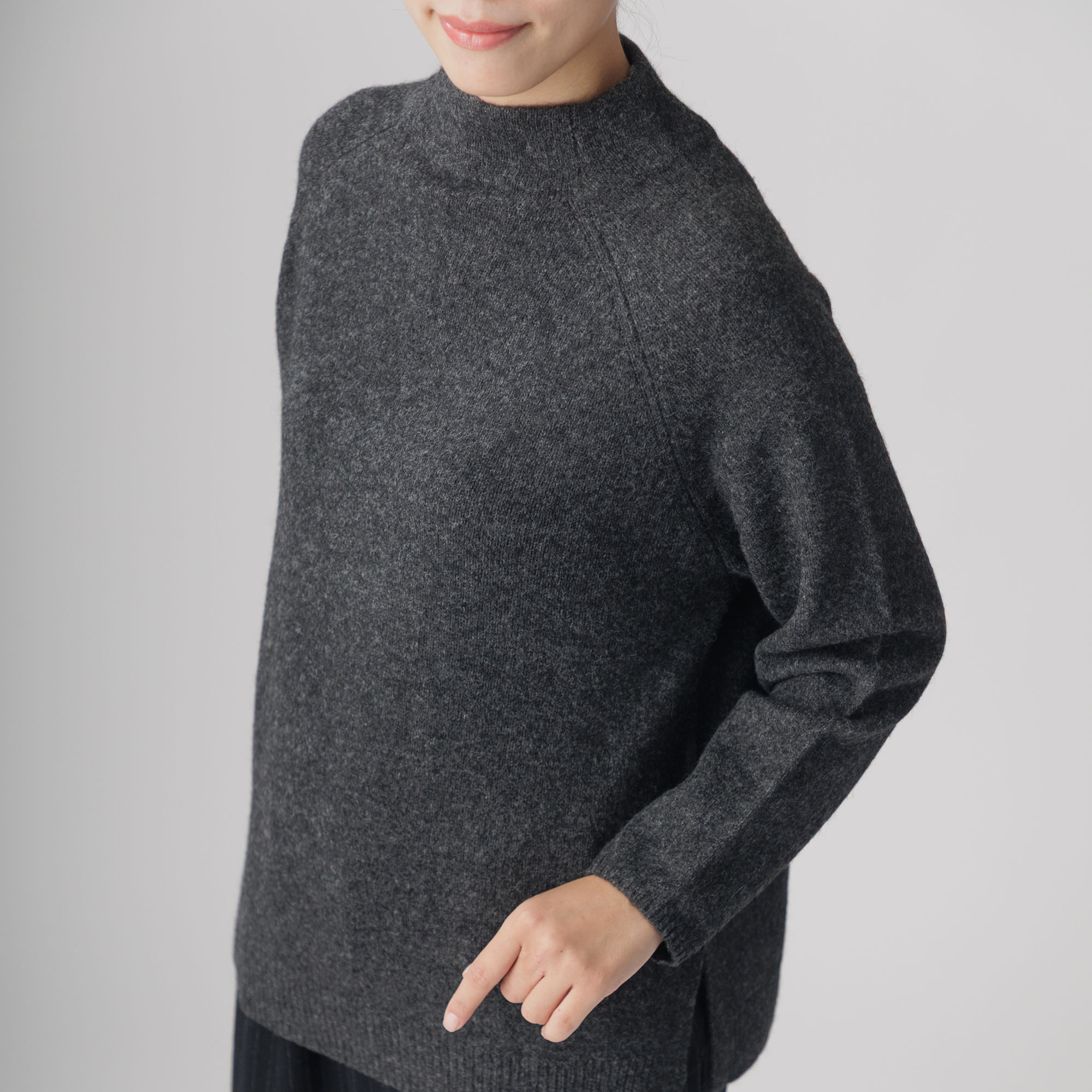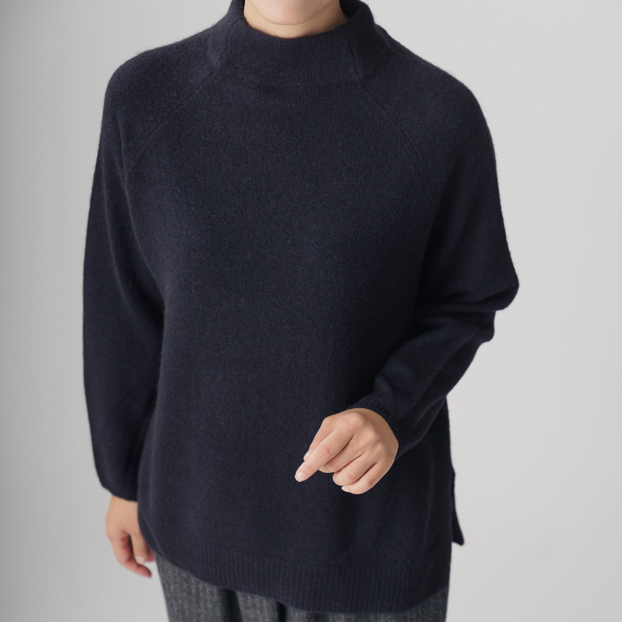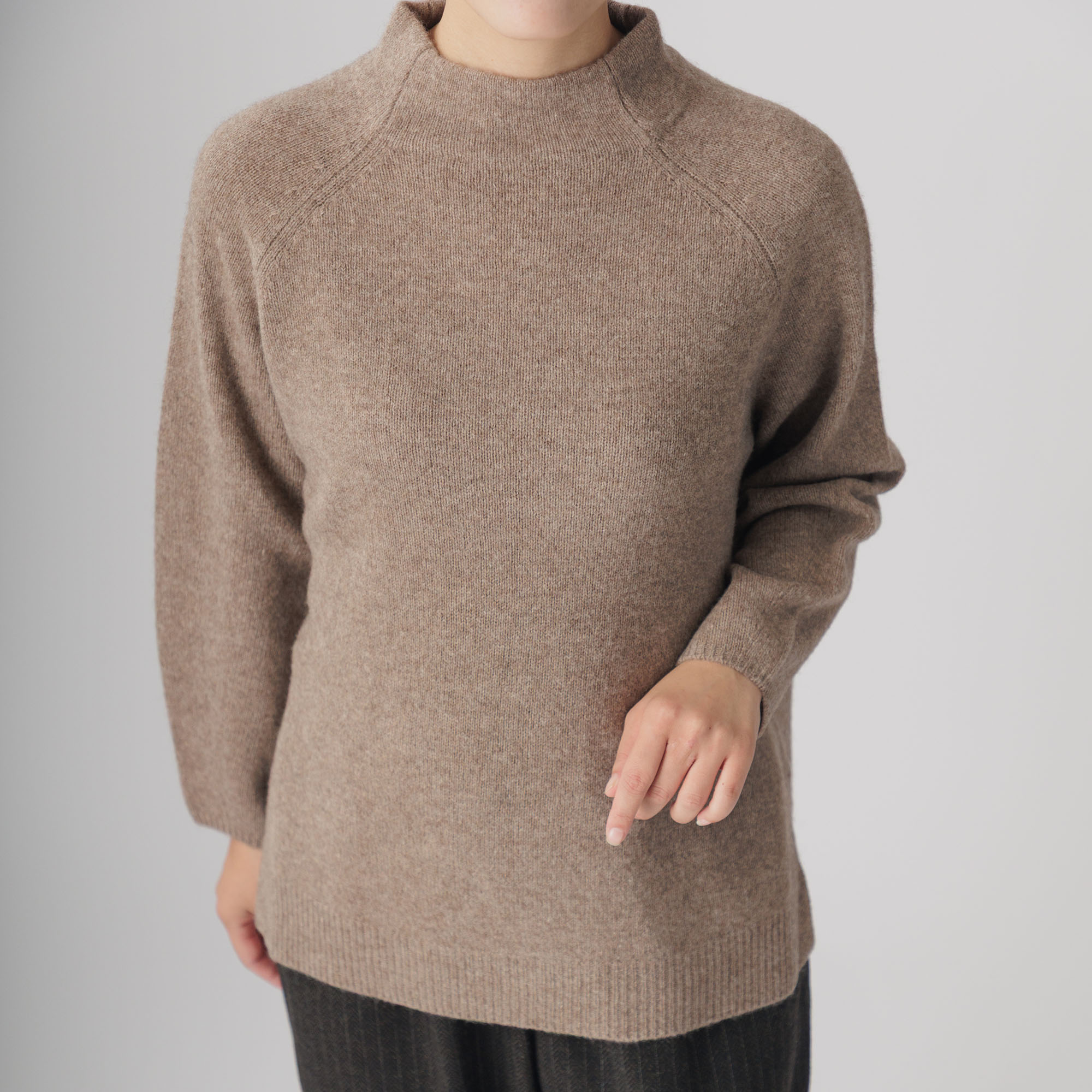 ラグラン袖と首周りを優しく包むボトルネックが個性を放ち、
