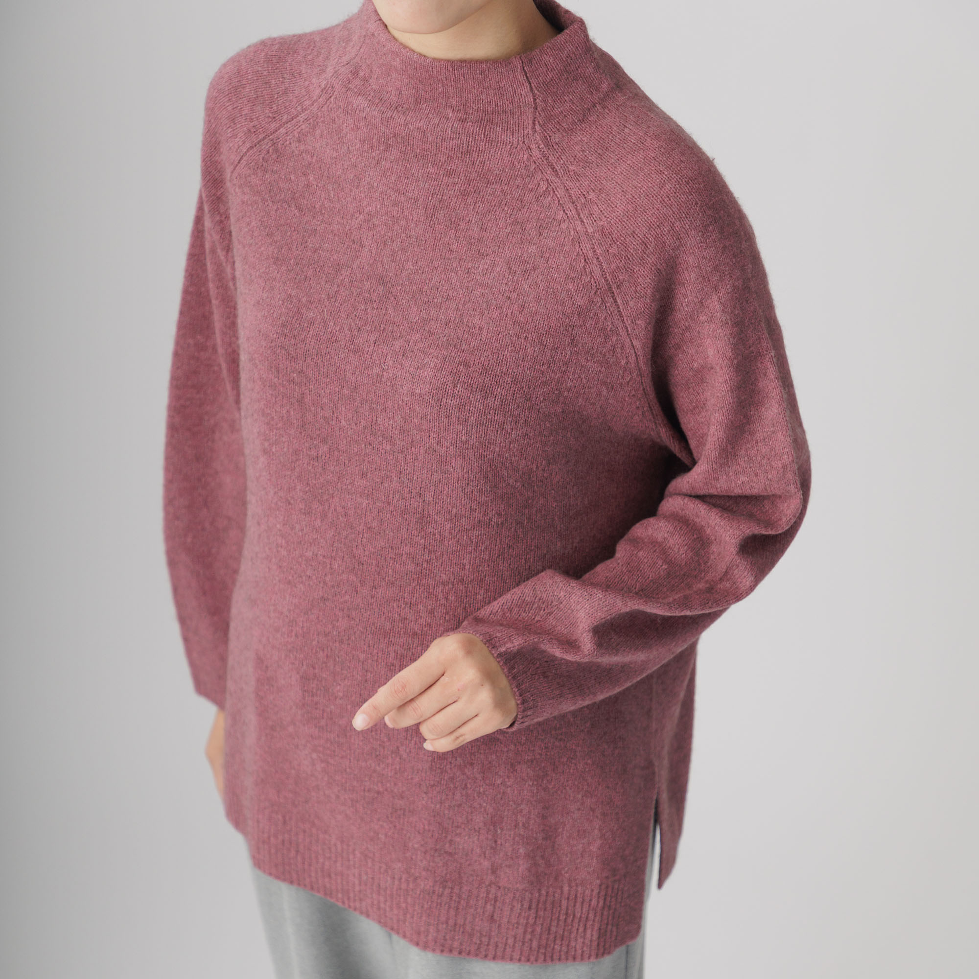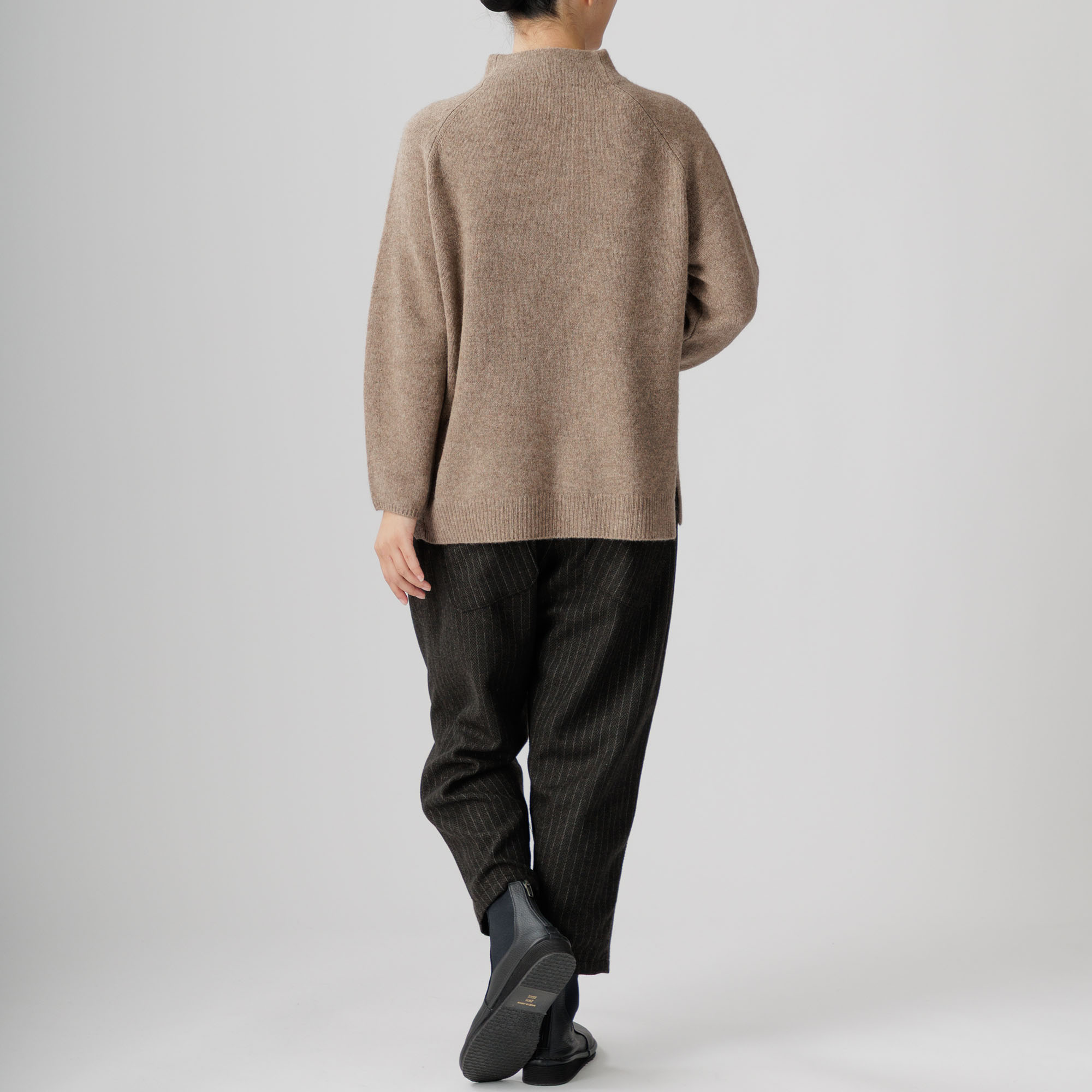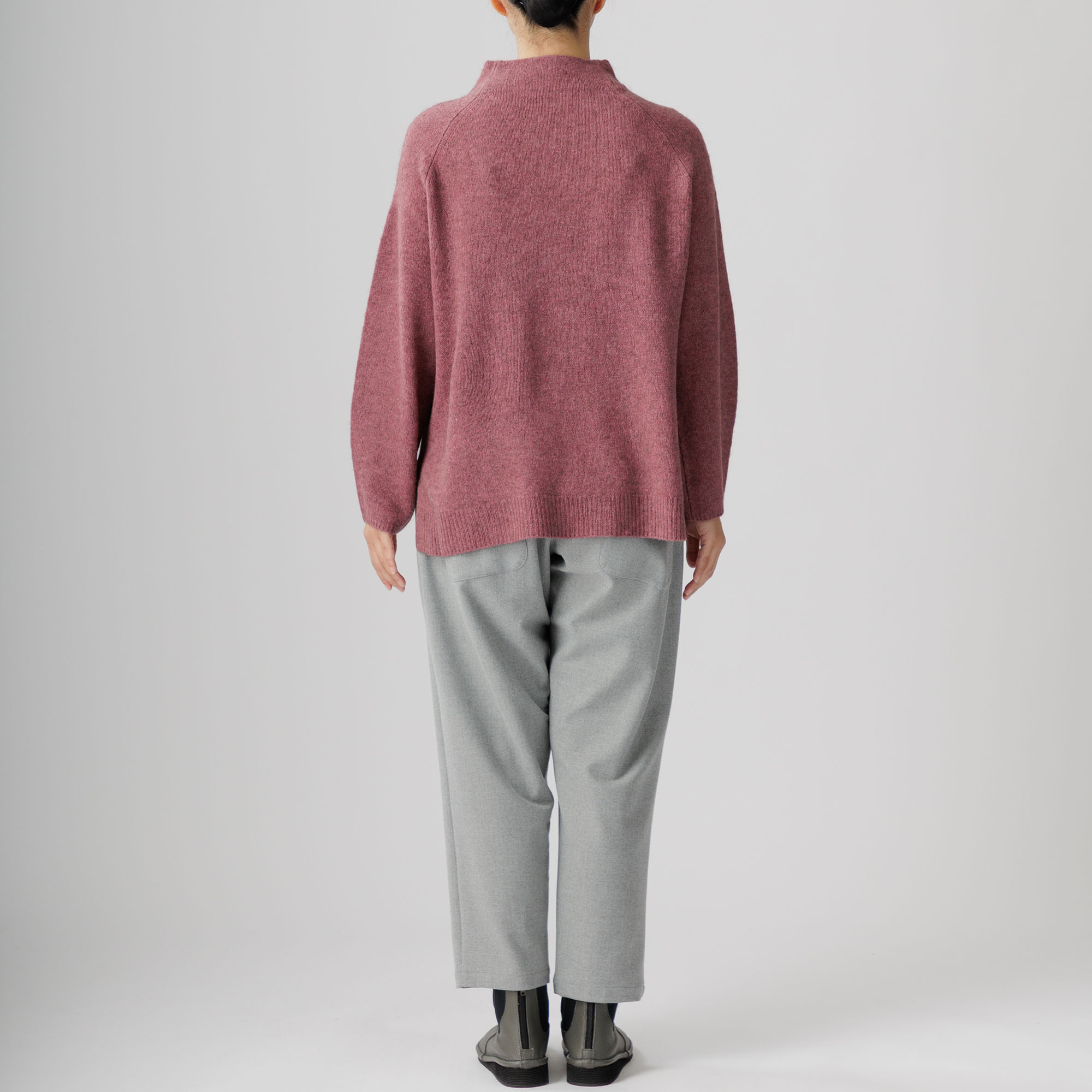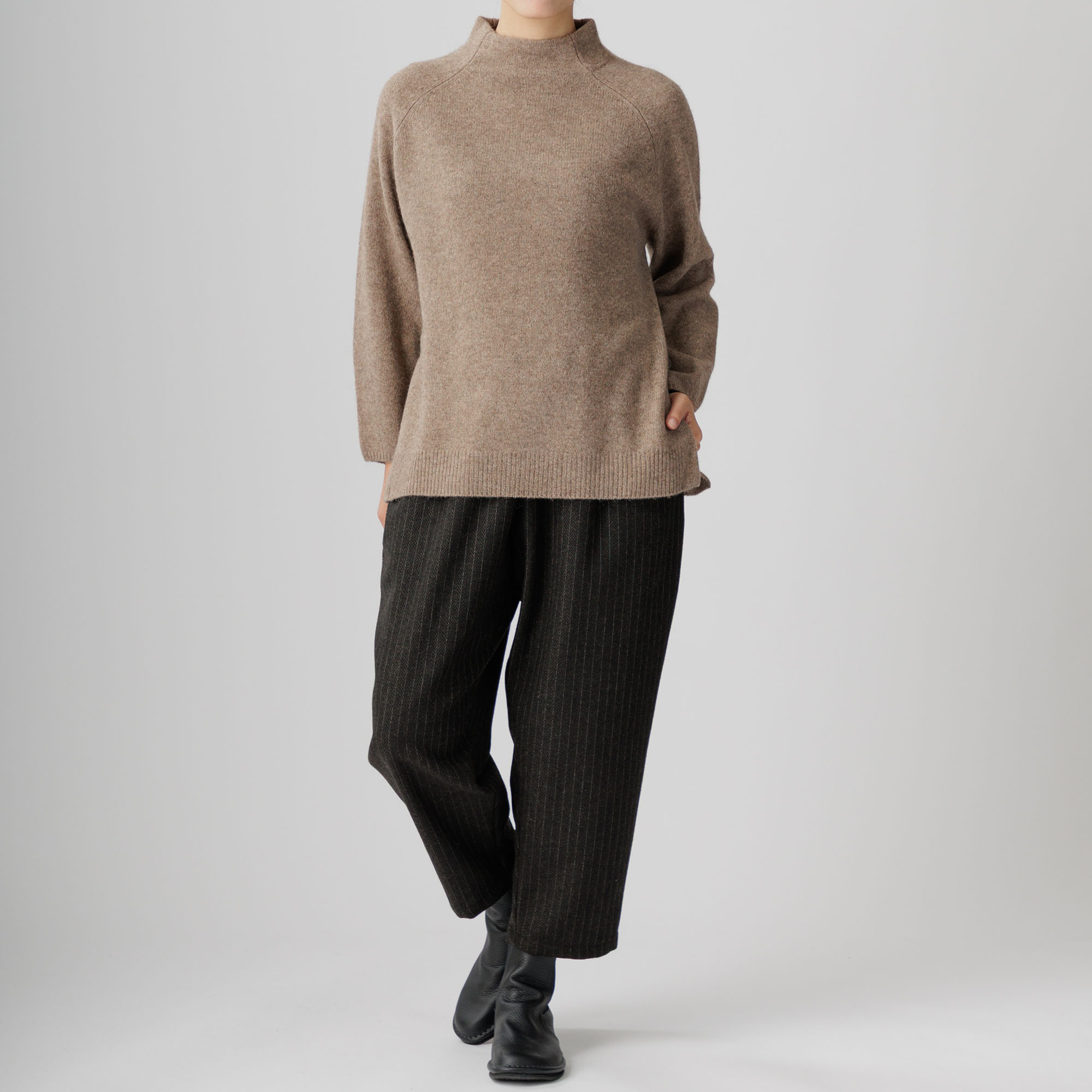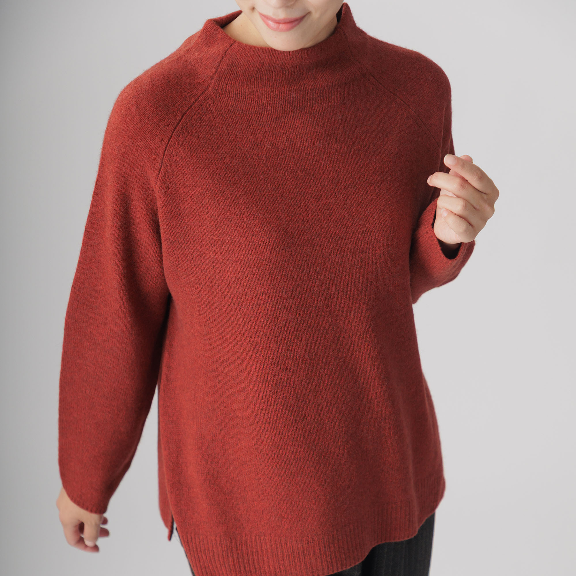 ラグラン袖と首周りを優しく包むボトルネックが個性を放ち、