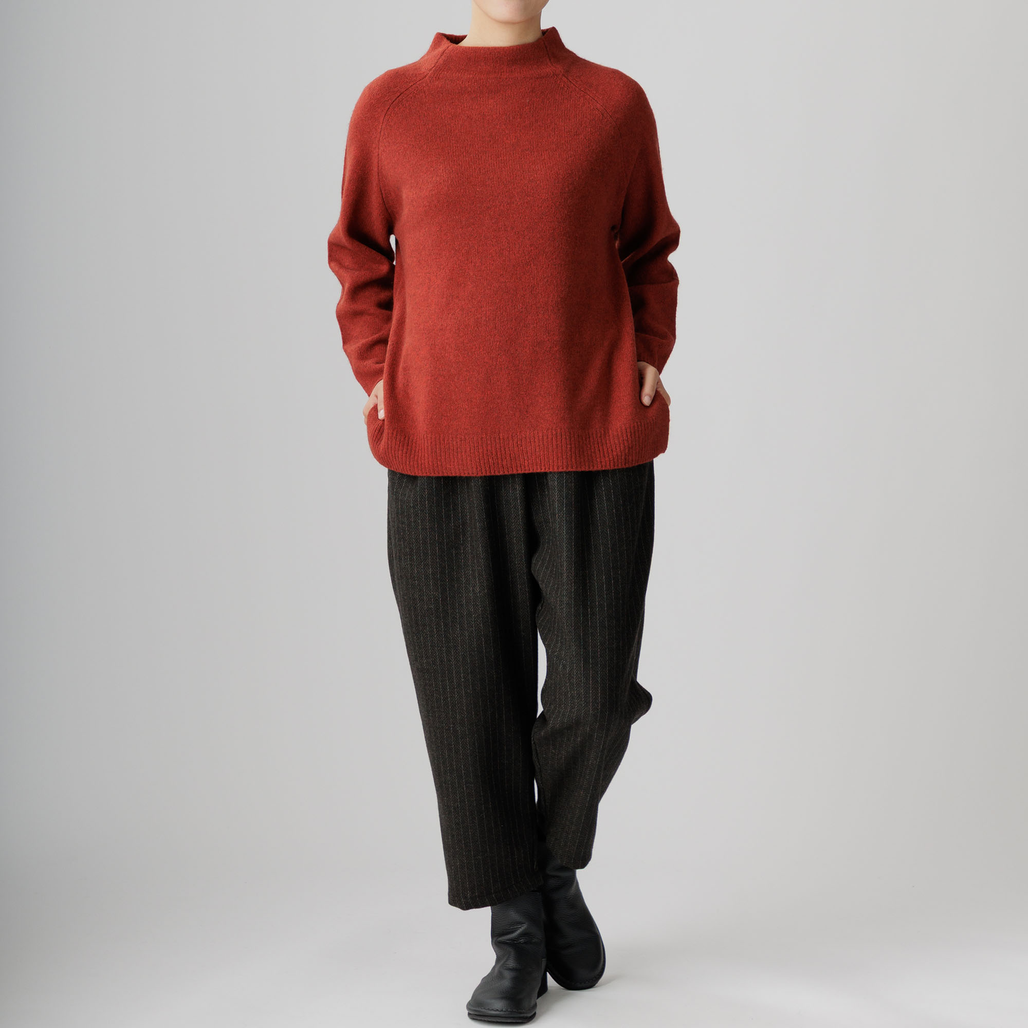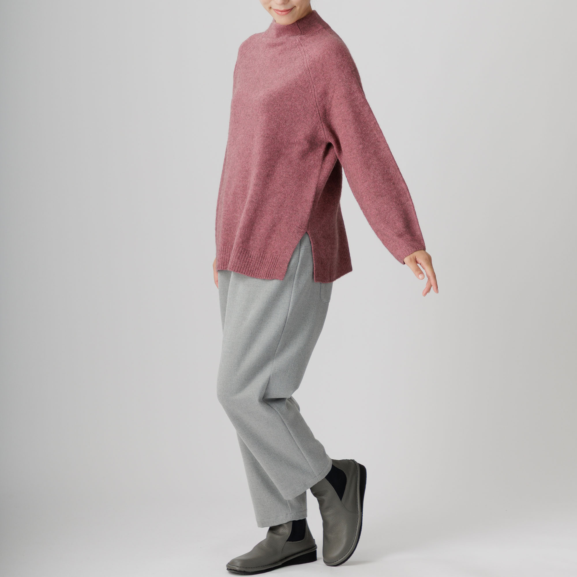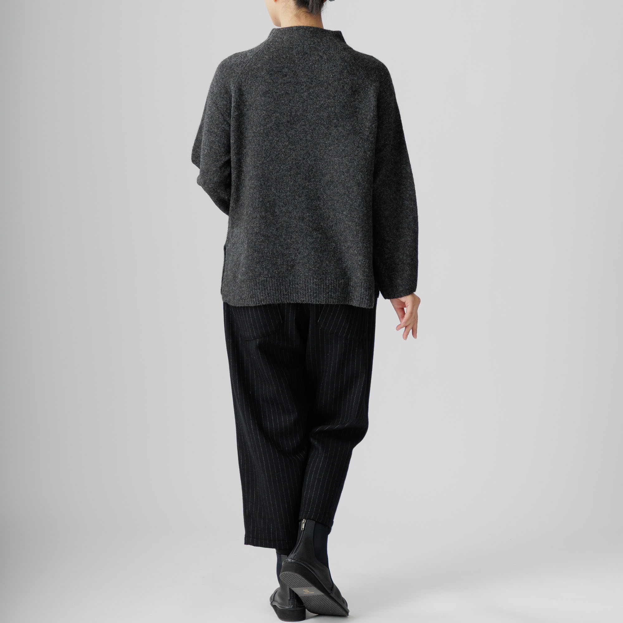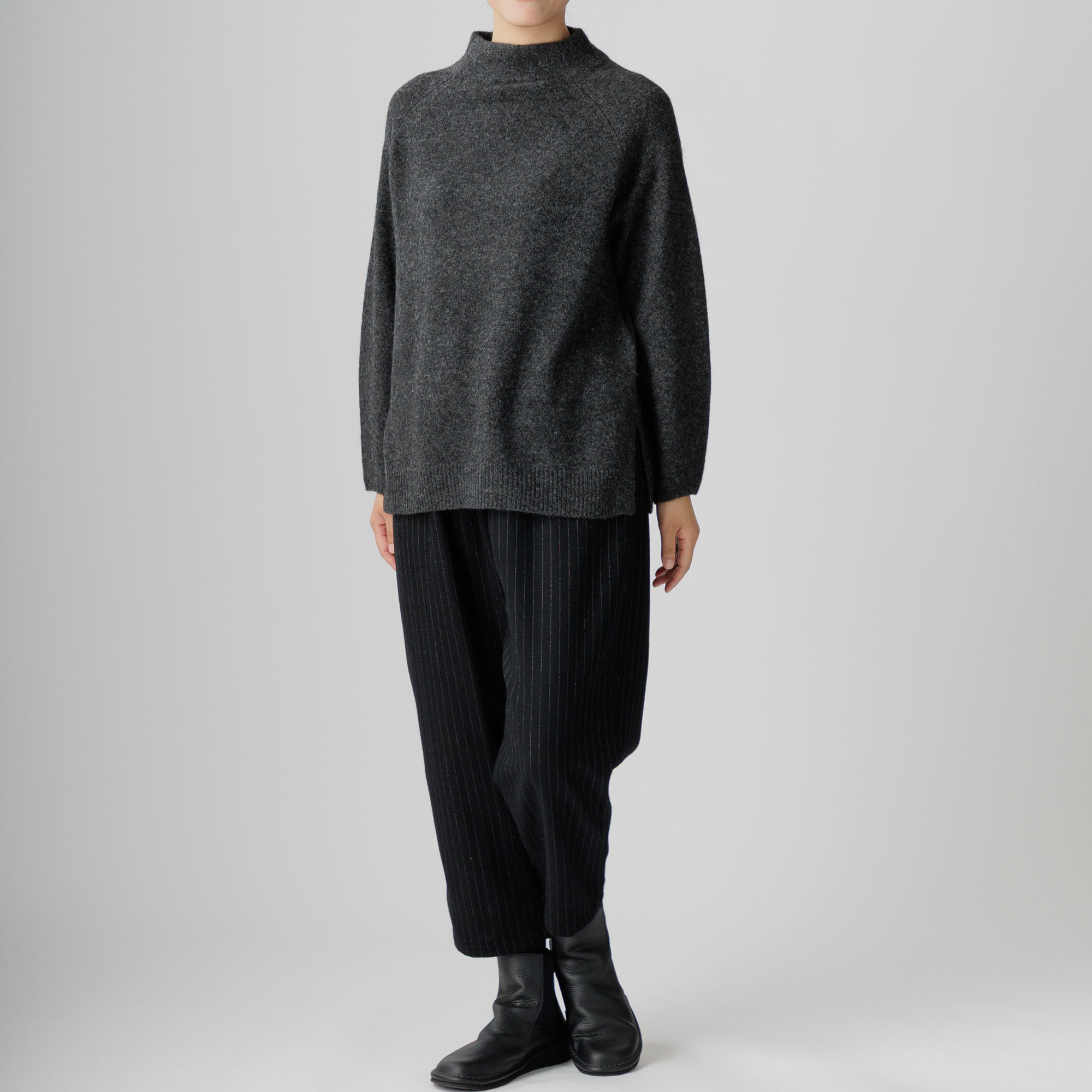 ラグラン袖と首周りを優しく包むボトルネックが個性を放ち、