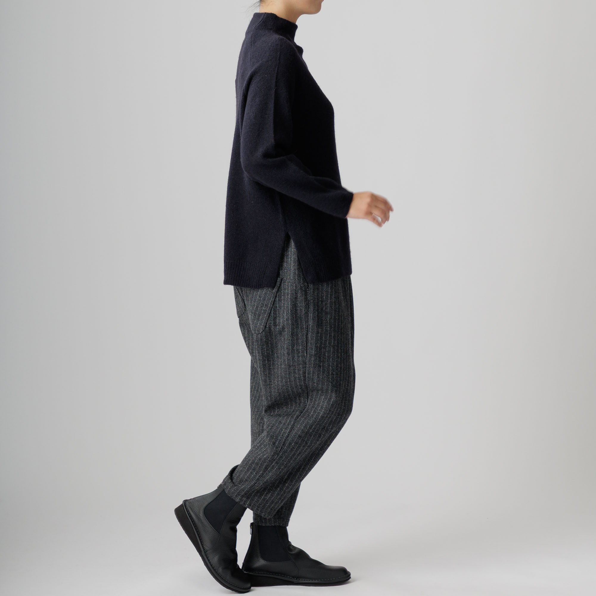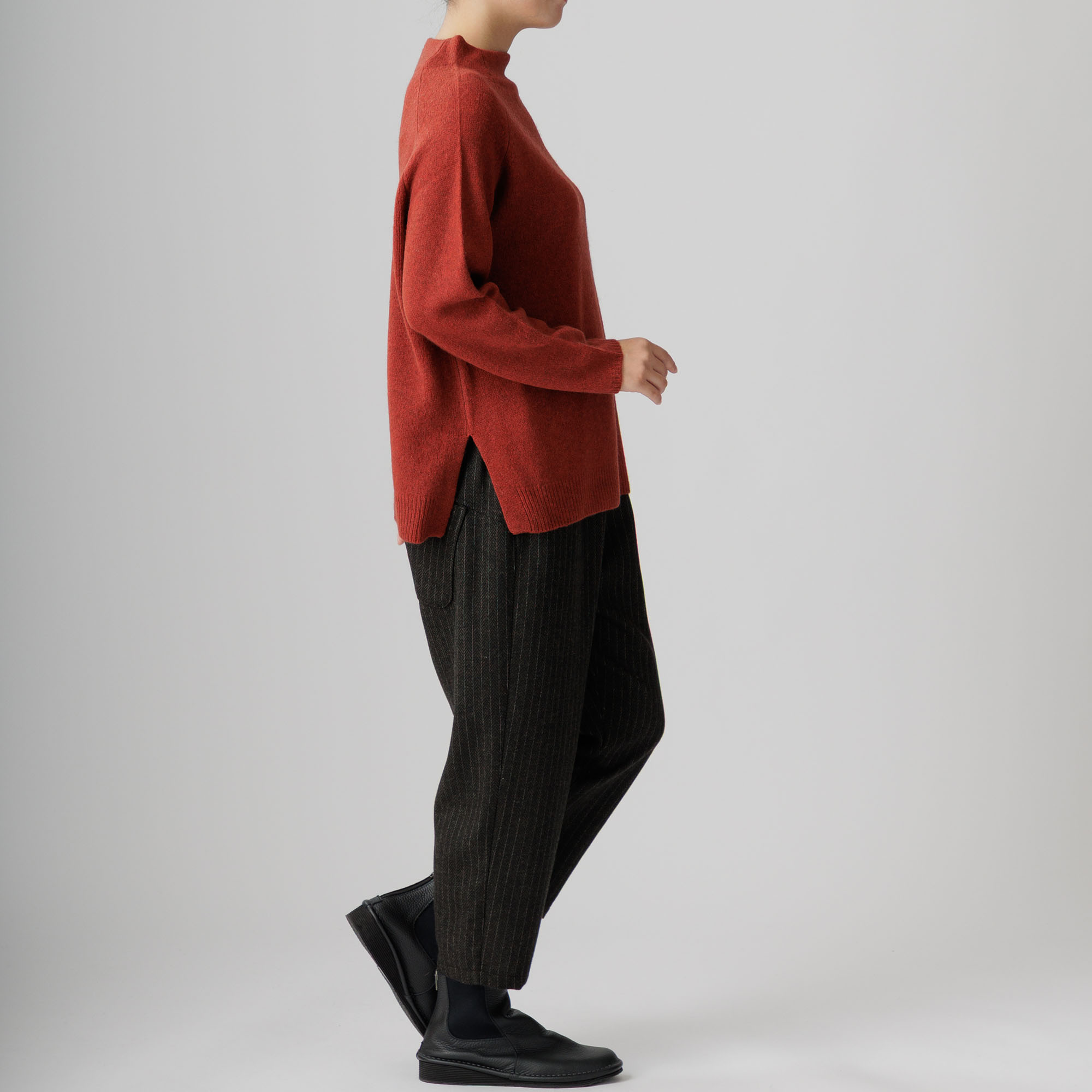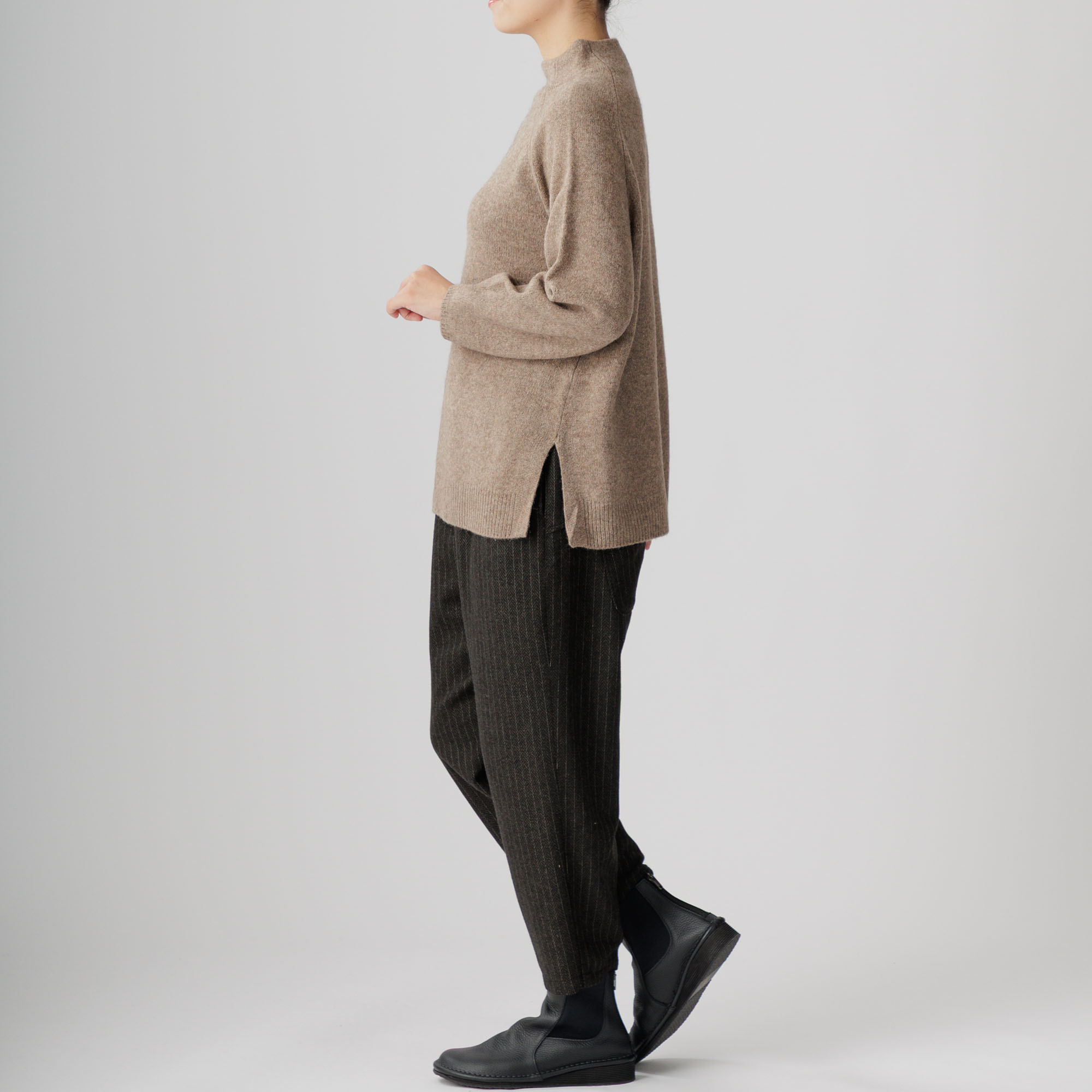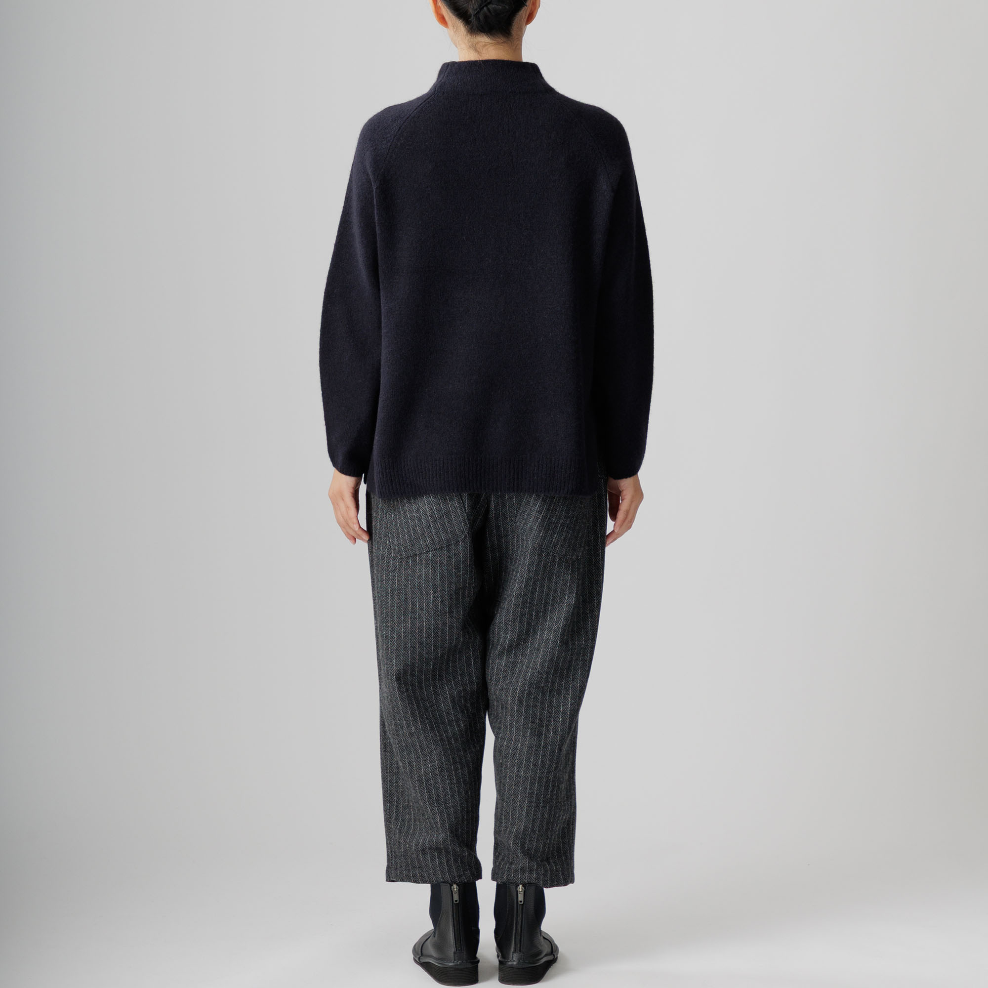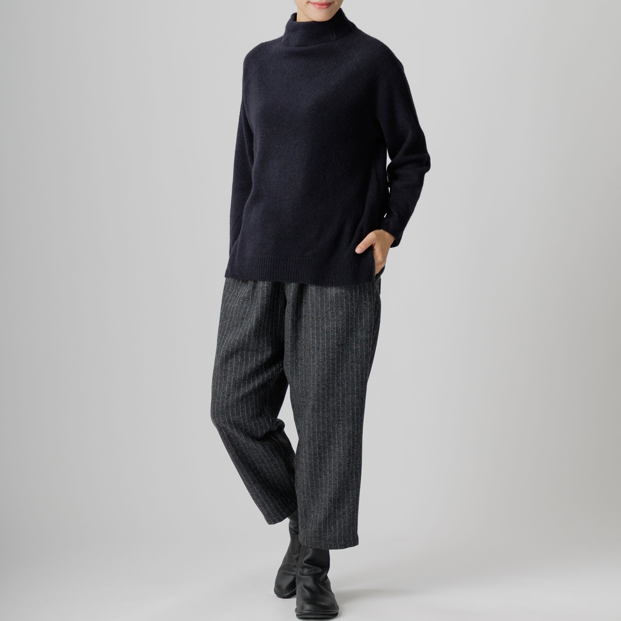 ラグラン袖と首周りを優しく包むボトルネックが個性を放ち、