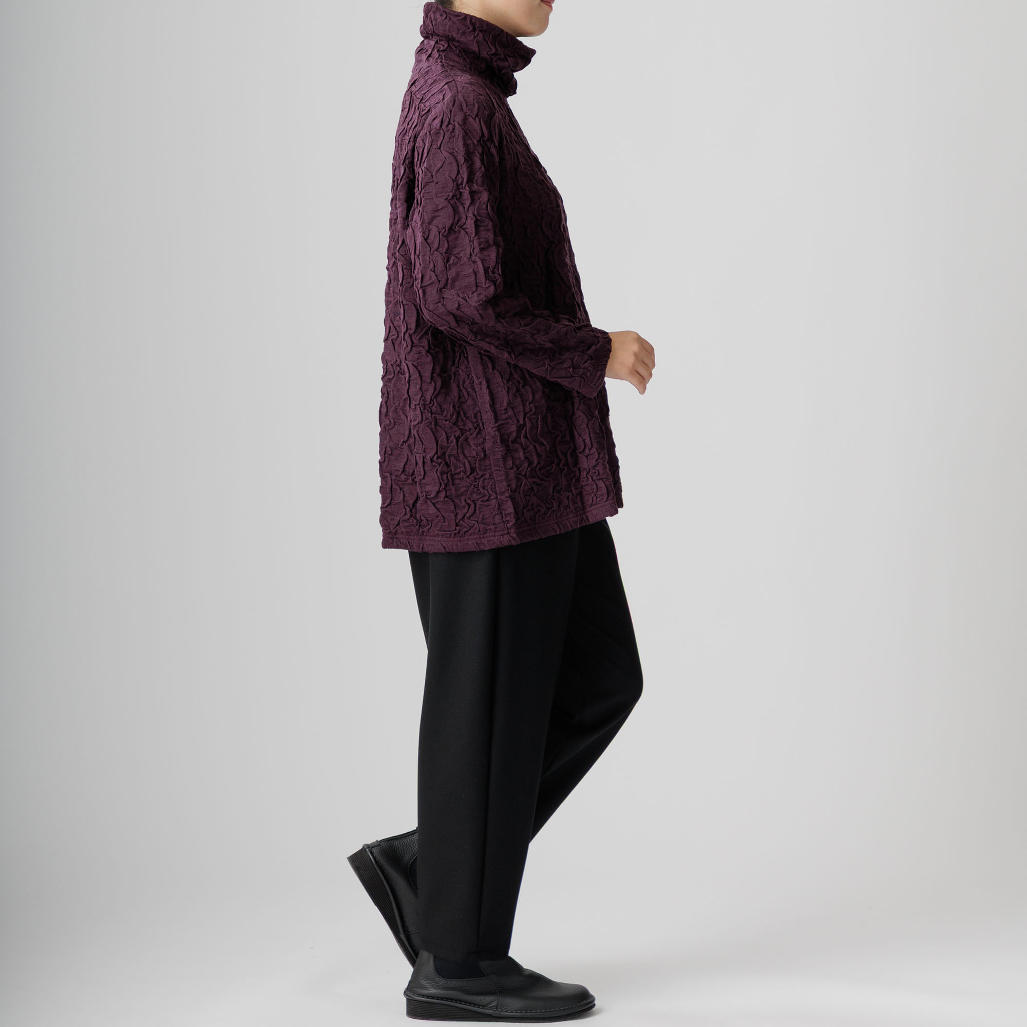 ボリュームのある高めのハイネックが温かみのある個性的な着姿を作り、