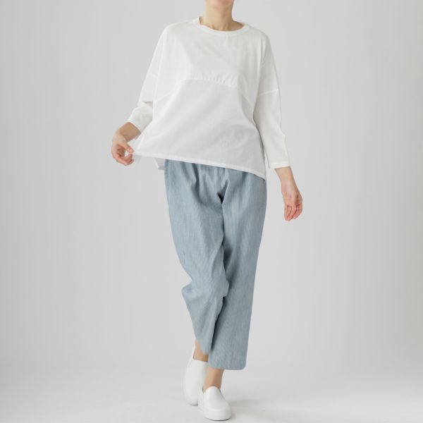 前身頃の大きくラウンドした切り替えラインとドルマンタイプの袖がデザインの特徴で、