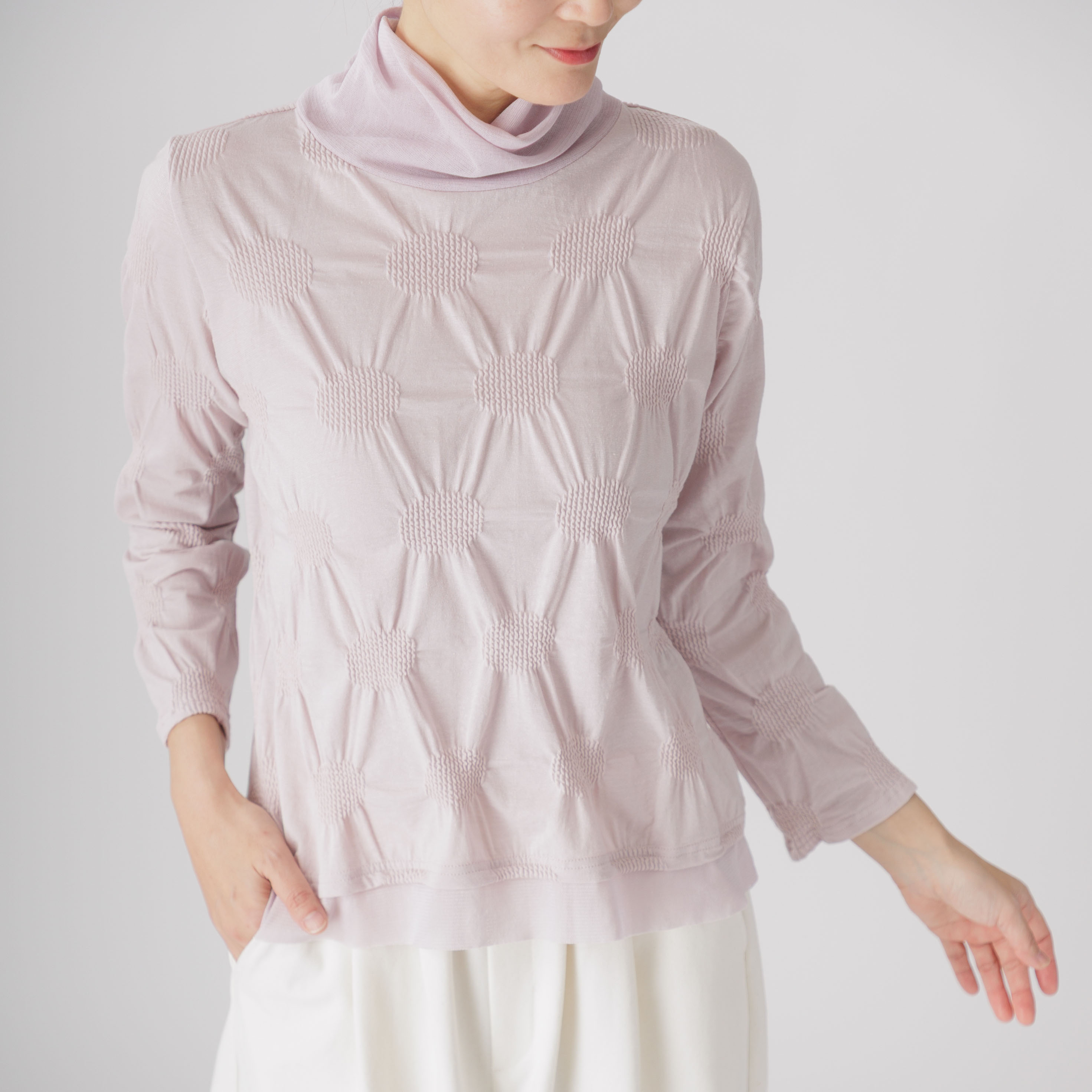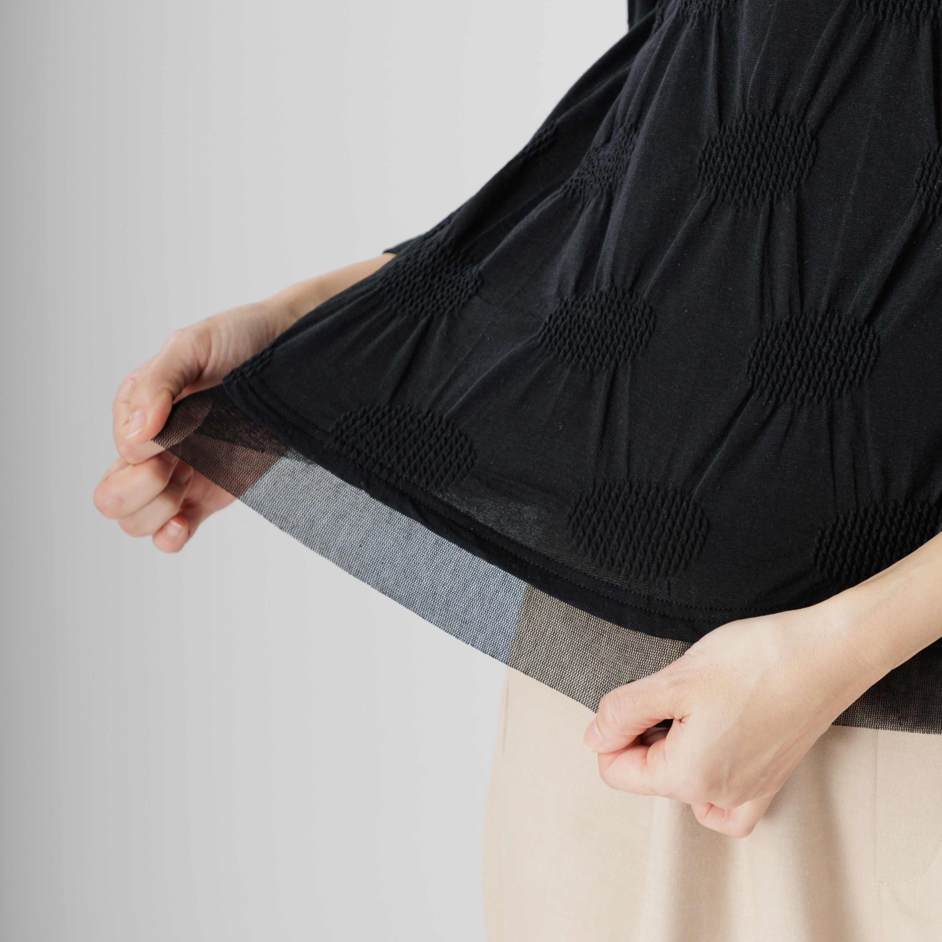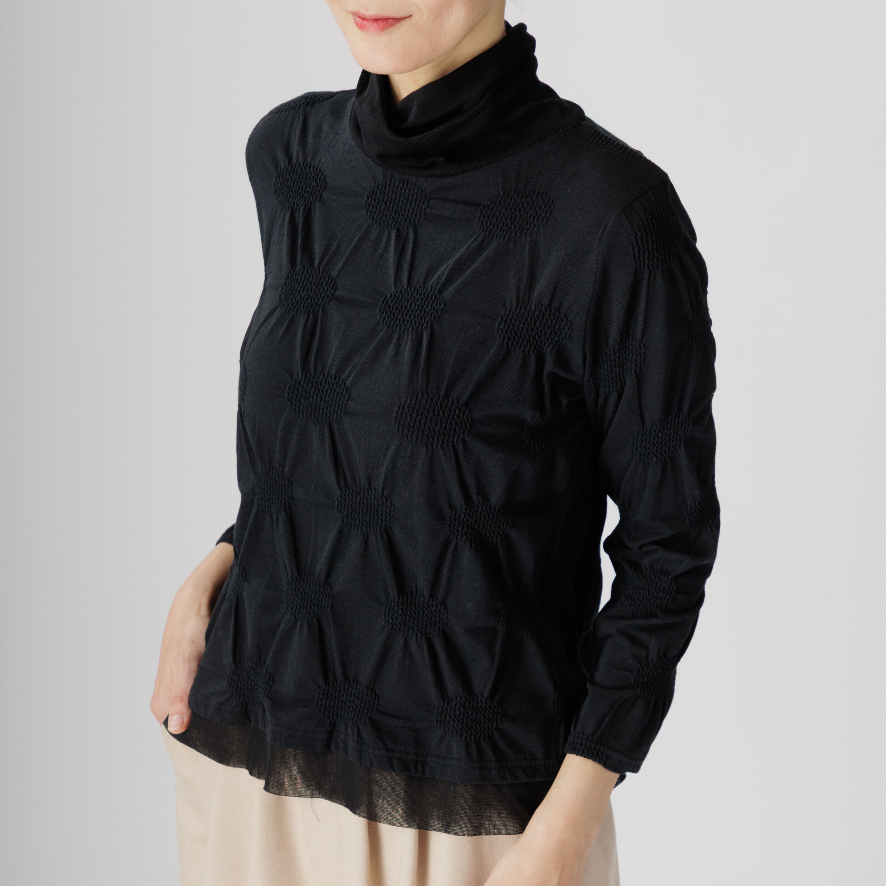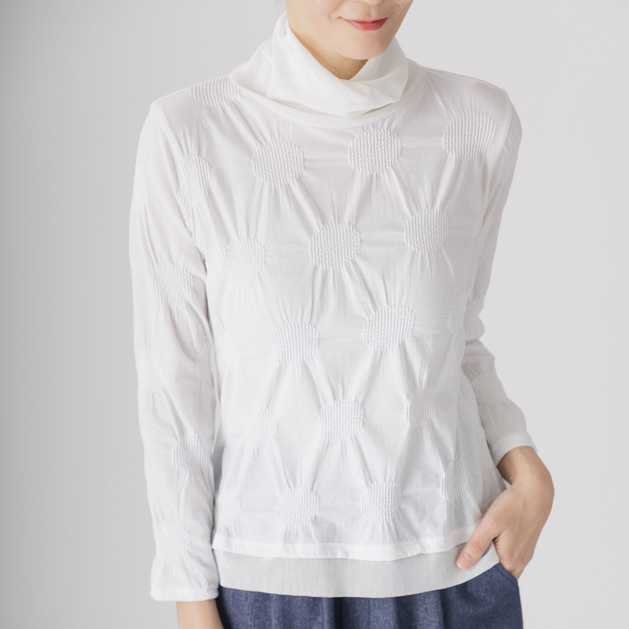 シャーリングで生み出した格子状に繋がった水玉模様が個性を放つ、