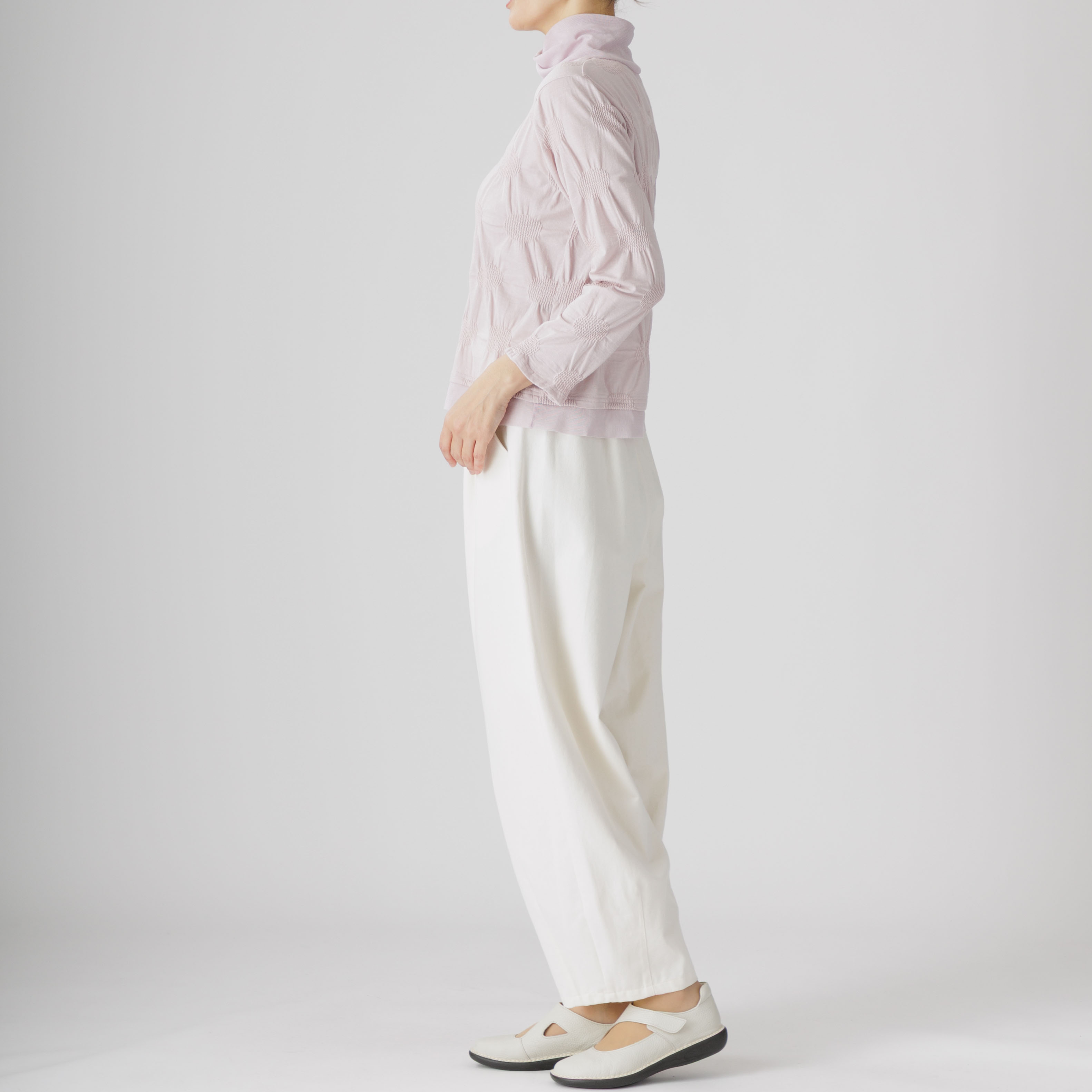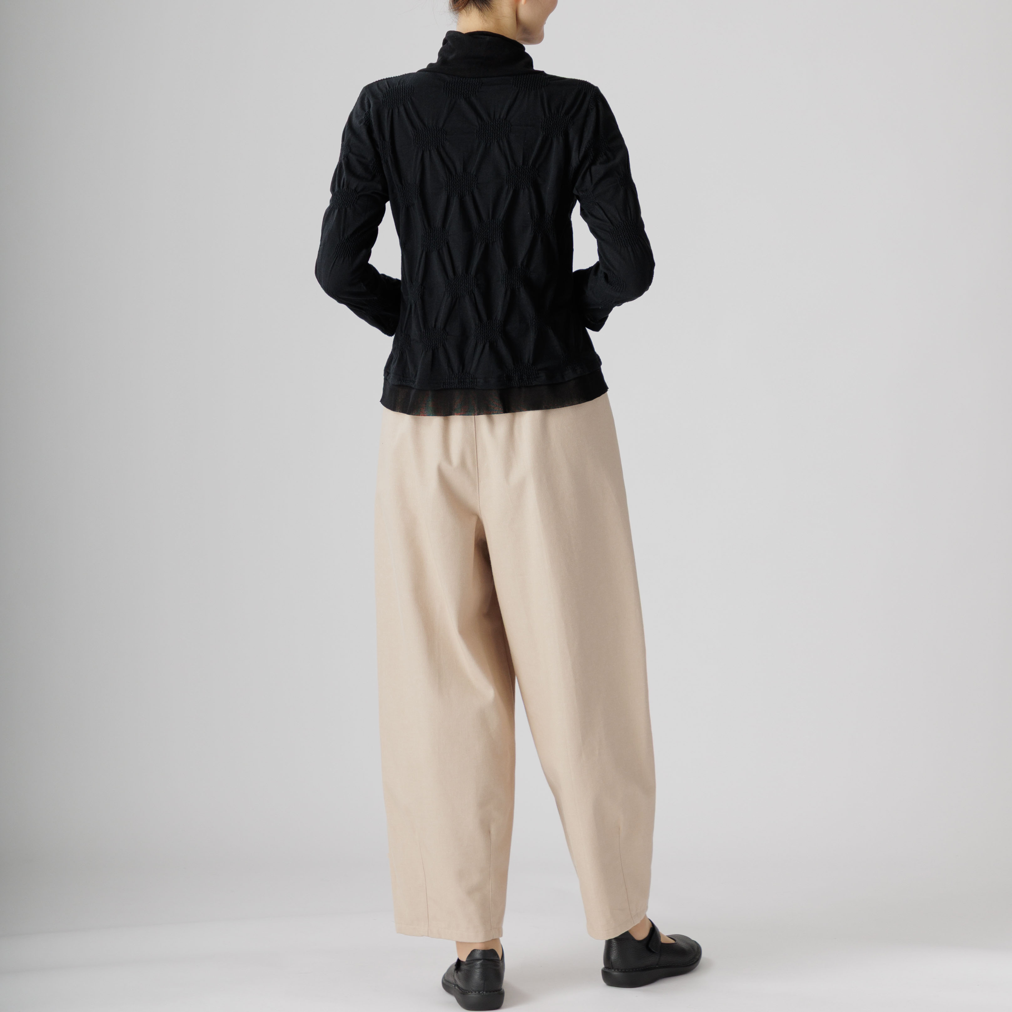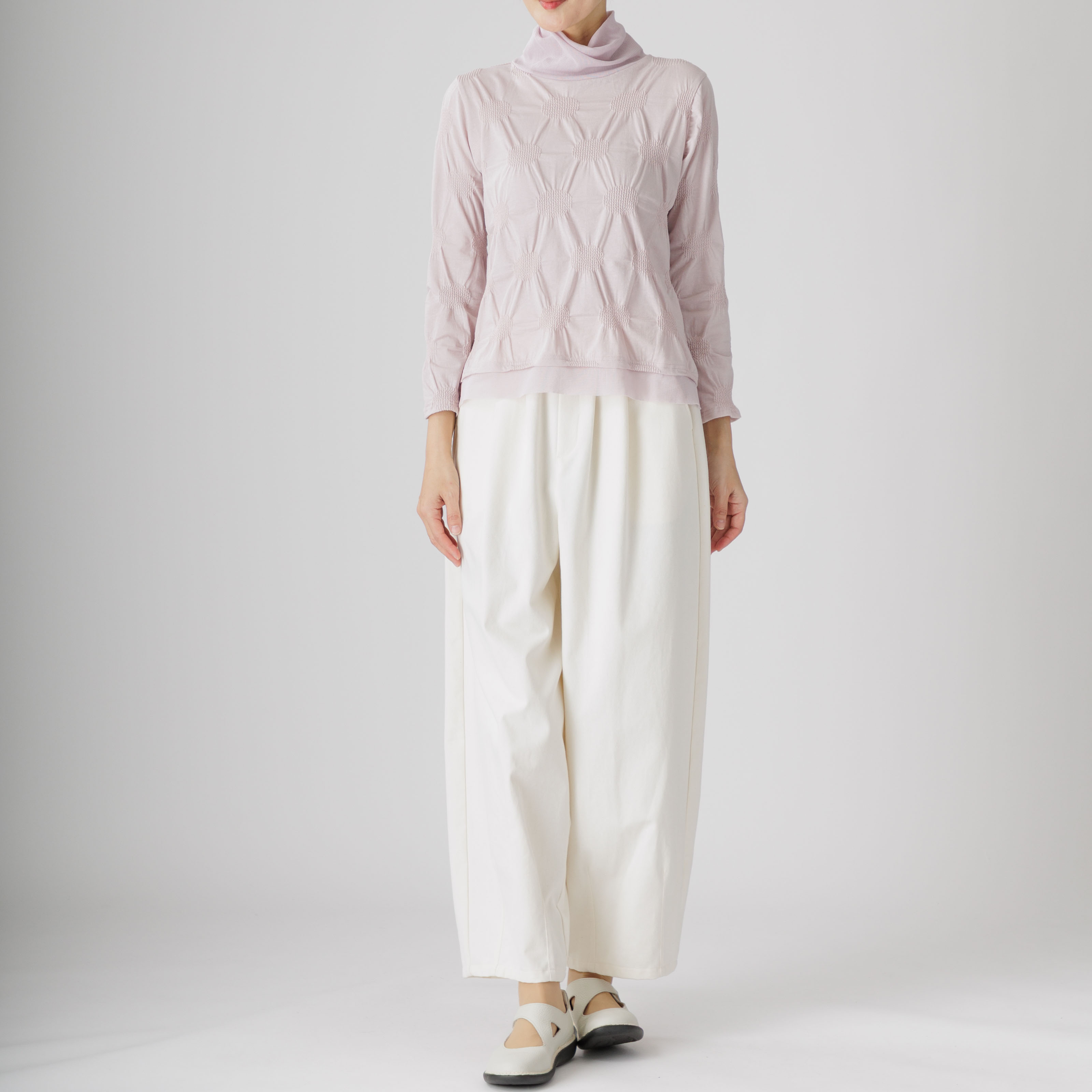 シャーリングで生み出した格子状に繋がった水玉模様が個性を放つ、