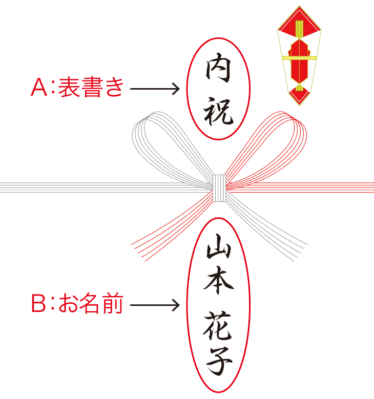 「のし表書き」をご希望の方は下の例を参考にして、【A:表書きの内容】(御中元・御歳暮・粗品・寸志等)と【B:お名前】(名字・会社名等)を「通信欄」にお知らせください。